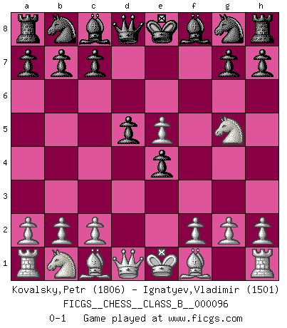 Last move : 0-1 2010 January 7 19:27:35 [Event "FICGS__CHESS__CLASS_B__000096"] [Site "FICGS"] [Date "2010.01.03"] [Round "1"] [White "Kovalsky,Petr"] [Black "Ignatyev,Vladimir"] [Result "0-1"] [WhiteElo "1806"] [BlackElo "1501"] 1.e4 e5 2.Nf3 d6 3.d4 f5 4.dxe5 fxe4 5.Ng5 d5 0-1 Philidor : Philidor counter-gambit Player Black won this chess game. Follow this game move after move (download)The sign of a great Master is his ability to win a won game quickly and painlessly. (Irving Chernev) Drei Punkte vor allen anderen ist wie einer, der im weißen Anzug posiert, während der Rest in Müllsäcke gekleidet dasteht. (Viktor Kortschnoi) Ayuda a tus piezas para que ellas te puedan ayudar. (Paul Morphy) Le pion, dans sa simplicité, marche droit devant lui, mais lorsqu'il prend, il le fait obliquement? Ainsi l'homme, tant qu'il reste pauvre, marche dans la droiture et vit honnêtement, mais lorsqu'il recherche les honneurs, il flatte, se parjure et, par les voies obliques, cherche une position supérieure sur l'échiquier du monde. (Jean de Galles) I take risks, sometimes patients die, but not taking risks causes more patients to die. So I guess my biggest problem is I've been cursed with the ability to do the math. (Gregory House, House M.D.)
