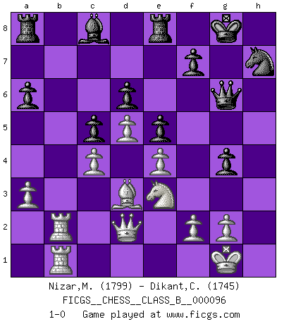 Last move : 1-0 2010 September 5 11:14:41 [Event "FICGS__CHESS__CLASS_B__000096"] [Site "FICGS"] [Date "2010.01.03"] [Round "1"] [White "Nizar,Muhammad"] [Black "Dikant,Christophe"] [Result "1-0"] [WhiteElo "1799"] [BlackElo "1745"] 1.d4 c5 2.d5 e5 3.c4 d6 4.Nc3 Be7 5.e4 a6 6.Bd3 Bg5 7.Nf3 Bxc1 8.Qxc1 Ne7 9.h3 O-O 10.O-O Nd7 11.a3 h6 12.Qe3 Ng6 13.Rab1 Nf4 14.b4 b6 15.Ne2 Nxe2+ 16.Qxe2 Nf6 17.Ne1 g5 18.Qd2 Nh7 19.Nc2 Re8 20.bxc5 bxc5 21.Rb2 h5 22.Rfb1 Qf6 23.Be2 g4 24.hxg4 hxg4 25.Ne3 Qg6 26.Bd3 1-0 Old Benoni defense Kingside Castling by player Black (move 9) Kingside Castling by player White (move 10) Player White won this chess game. Follow this game move after move (download)Modern Chess is too much concerned with things like Pawn structure. Forget it, Checkmate ends the game. (Nigel Short) Schachspieler können ausgezeichnet Varianten am Schachbrett berechnen, aber nicht im realen Leben. Zu stark ist der Individualismus im Schach ausgeprägt, und für viele ist ein kleiner momentaner persönlicher Vorteil wichtiger als ein weit größerer Vorteil von morgen. (Anatoly Karpov) No es una movida, aún la mejor movida que tu debas buscar, sino un plan comprensible. (Eugene Znosko-Borovsky) Donnez-moi un Cavalier en 6e et je gagnerais toutes mes parties. (Steinitz) It's not enough to succeed. Others must fail. (Gore Vidal)