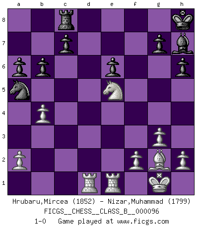 Last move : 1-0 2010 August 7 10:13:54 [Event "FICGS__CHESS__CLASS_B__000096"] [Site "FICGS"] [Date "2010.01.03"] [Round "1"] [White "Hrubaru,Mircea"] [Black "Nizar,Muhammad"] [Result "1-0"] [WhiteElo "1852"] [BlackElo "1799"] 1.d4 d5 2.Nf3 Nf6 3.g3 Bf5 4.Bg2 e6 5.O-O Nc6 6.c4 dxc4 7.Nc3 Be7 8.Qa4 O-O 9.Qxc4 Rb8 10.Re1 a6 11.e4 Bg6 12.Bg5 h6 13.Bxf6 Bxf6 14.e5 Be7 15.d5 Na5 16.Qa4 b6 17.Rad1 exd5 18.Nxd5 Qe8 19.Qg4 Rc8 20.Qxc8 Qxc8 21.Nxe7+ Kh8 22.Nxc8 Rxc8 23.e6 fxe6 24.Ne5 Bh7 25.b4 1-0 This chess game has been lost on time (started : 2010.01.03 15:54:39) Queen's pawn game Kingside Castling by player White (move 5) Kingside Castling by player Black (move 8) Player White won this chess game. Follow this game move after move (download)You have to have the fighting spirit. You have to force moves and take chances. (Bobby Fischer) Matt entspricht nicht immer den Tatsachen. (Savielly Grigorievitsch Tartakower) Una victoria por una combinación errónea, aunque sea espectacular, me llena de horror artístico. (Wilhelm Steinitz) Botvinnik disait en comparant les échecs à la musique: Il existe une science dont le but est l'étude de l'acoustique et des sons. Mais il y a aussi un art qui se sert de l'océan des sons : c'est la musique. De toute évidence, il en est de même pour la pensée. La logique est l'étude des lois de la réflexion et les échecs reflètent, en tant qu'art, le côté logique de la réflexion, sous la forme d'images artistiques... Extrait de Fischer - Spassky, Reykjavik 1972 par Alexander & F. Wyndham (Ed. Solar), p 37. Whenever people agree with me, I always feel I must be wrong. (Oscar Wilde)