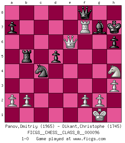 Last move : 1-0 2010 February 14 20:28:22 [Event "FICGS__CHESS__CLASS_B__000096"] [Site "FICGS"] [Date "2010.01.03"] [Round "1"] [White "Panov,Dmitriy"] [Black "Dikant,Christophe"] [Result "1-0"] [WhiteElo "1965"] [BlackElo "1745"] 1.e4 g6 2.d4 Bg7 3.Nf3 c6 4.Bd3 d5 5.e5 Bg4 6.Nbd2 e6 7.h3 Bxf3 8.Nxf3 Nd7 9.O-O Qc7 10.Re1 c5 11.dxc5 Qxc5 12.Be3 Qc7 13.Rc1 Ne7 14.c4 Qd8 15.Bg5 h6 16.Bxe7 Qxe7 17.cxd5 exd5 18.Rc7 Qd8 19.Qc2 O-O 20.Bb5 Nb6 21.Rxb7 Rc8 22.Qd2 Rc5 23.e6 Qa8 24.Rxf7 Rxb5 25.Qc2 Rxf7 26.exf7+ Kxf7 27.Nh4 Nc4 28.Qxg6+ Kf8 29.Qf5+ Kg8 30.Re7 Qf8 31.Qe6+ Kh7 32.Rf7 1-0 Robatsch (Modern) defense Kingside Castling by player White (move 9) Kingside Castling by player Black (move 19) Player White won this chess game. Follow this game move after move (download)One of these modest little moves may be more embarrassing to your opponent than the biggest threat. (Siegbert Tarrasch) Wie ich sie so einen nach dem anderen nieder mähte wurde meine Überlegenheit offensichtlich. (José Raúl Capablanca) Vive, pierde y aprende al observar a tu oponente como ganar. (Amber Steenbock) Il vaut mieux sacrifier les pièces de l'adversaire. (Xavier Tartacover) Indecision is the key to flexibility. (Unknown)