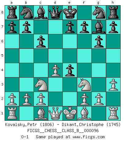Last move : 0-1 2010 January 7 19:27:26 [Event "FICGS__CHESS__CLASS_B__000096"] [Site "FICGS"] [Date "2010.01.03"] [Round "1"] [White "Kovalsky,Petr"] [Black "Dikant,Christophe"] [Result "0-1"] [WhiteElo "1806"] [BlackElo "1745"] 1.e4 g6 2.d4 Bg7 3.Nc3 c6 4.Nf3 d5 5.h3 dxe4 0-1 Robatsch defense Player Black won this chess game. Follow this game move after move (download)White lost because he failed to remember the right continuation and had to think up the moves himself. (Siegbert Tarrasch) Wenn du nicht weißt was du tun sollst, warte bis dein Gegner eine Idee hat. Sie wird sicher schlecht sein. (Siegbert Tarrasch) En la vida, como en el Ajedrez, los Peones propios obstruyen nuestro camino. La gran fortuna de un hombre, su comodidad, placer, hijos, libros, que deberían ayudarle a ganar, con mucha frecuencia lo ponen en Jaque Mate. (Charles Buxton) Les échecs sont un jeu terrible. Si vous n'avez pas le centre, votre adversaire a une position plus libre. Par contre, si vous avez le centre, alors vous avez vraiment quelque chose pour laquelle vous inquiéter ! (Siegbert Tarrasch) The age of a woman doesn't mean a thing. The best tunes are played on the oldest fiddles. (Ralph Waldo Emerson)