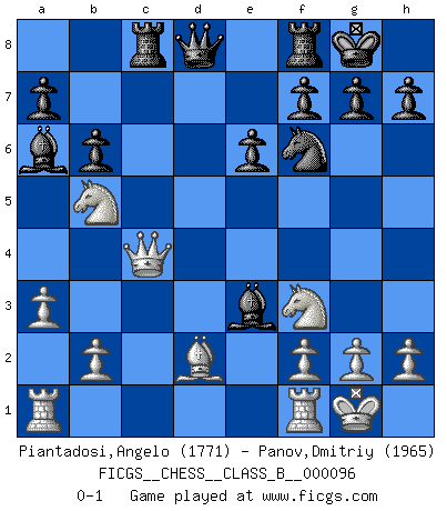 Last move : 0-1 2010 February 4 22:5:46 [Event "FICGS__CHESS__CLASS_B__000096"] [Site "FICGS"] [Date "2010.01.03"] [Round "1"] [White "Piantadosi,Angelo"] [Black "Panov,Dmitriy"] [Result "0-1"] [WhiteElo "1771"] [BlackElo "1965"] 1.d4 Nf6 2.c4 e6 3.Nc3 Bb4 4.Qc2 c5 5.dxc5 Nc6 6.e3 O-O 7.Nf3 Bxc5 8.Bd3 Nb4 9.Qb1 Nxd3+ 10.Qxd3 b6 11.O-O Ba6 12.a3 d5 13.Nb5 Rc8 14.Bd2 dxc4 15.Qxc4 Bxe3 0-1 Nimzo-Indian : Classical, 4...c5 Kingside Castling by player Black (move 6) Kingside Castling by player White (move 11) Player Black won this chess game. Follow this game move after move (download)Help your pieces so they can help you. (Paul Morphy) Wer nie einen Fehler gemacht hat, hat nie etwas Neues ausprobiert. (Albert Einstein) El Ajedrez, como cualquier otra actividad creativa, puede existir solo a través de méritos combinados de aquellos que tienen talento creativo y de aquellos que tienen la habilidad de organizar un trabajo creativo. (Mikhail Botvinnik) Horreur, mais aussi harmonie suprême : qu'y avait-il en effet au monde en dehors des échecs ? Le brouillard, l'inconnu, le non-être... (Vladimir Nabokov) Fame, I have already. Now I need the money. (an elderly Steinitz)