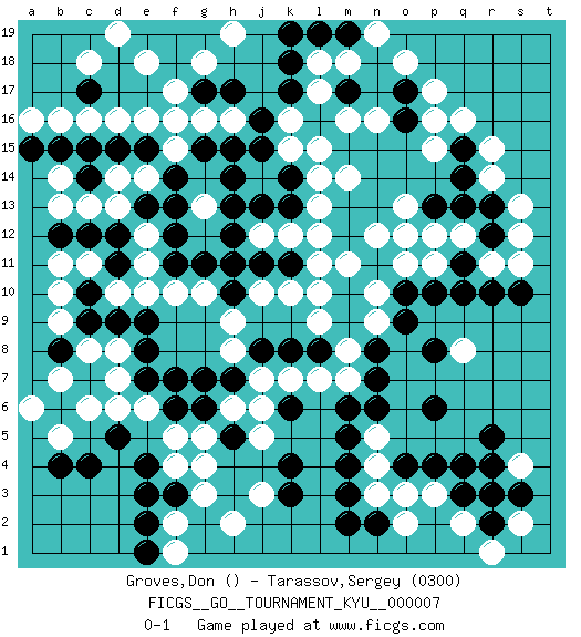 Last move : 0-1 2006 December 3 3:43:28 [Event "FICGS__GO__TOURNAMENT_KYU__000007"] [Site "FICGS"] [Date "2006.10.14"] [Round "1"] [Black "Groves,Don"] [White "Tarassov,Sergey"] [Result "0-1"] [Rating 2 "0300"] 1.q3 d16 2.c4 q16 3.r5 k16 4.k4 c6 5.c9 e6 6.e4 c11 7.e9 g4 8.f3 g3 9.d5 n4 10.k3 j3 11.q10 q12 12.m3 p3 13.p4 o3 14.o4 n3 15.m4 n5 16.p6 d13 17.f6 b9 18.b8 c8 19.c7 d8 20.d9 b10 21.e8 d7 22.e7 d6 23.n6 k10 24.m5 q2 25.r2 r3 26.q4 s2 27.n2 o2 28.m2 h6 29.k6 h8 30.k8 n9 31.b6 b7 32.s3 r1 33.r4 s4 34.r2 q8 35.r3 f5 36.f7 f10 37.h10 h9 38.h12 k12 39.h14 h16 40.f12 e11 41.g11 g10 42.k14 m14 43.f14 f16 44.b12 b14 45.d12 e12 46.e13 e14 47.f13 d14 48.f11 e10 49.j11 j10 50.g15 g13 51.k13 j12 52.k11 l11 53.h11 l13 54.j13 l12 55.j15 k15 56.h15 l14 57.h13 g16 58.r12 r11 59.r13 r14 60.q13 p12 61.q14 r15 62.q15 p15 63.o17 p17 64.o16 p16 65.q11 s11 66.p13 o13 67.r10 s13 68.o12 p11 69.p10 o11 70.o10 n12 71.n11 o12 72.p8 n10 73.s10 s12 74.n8 l9 75.l16 l17 76.m17 n16 77.k17 l18 78.k18 m16 79.j16 l15 80.h17 h19 81.g17 f17 82.l19 m18 83.m19 n19 84.k19 o18 85.f18 e18 86.g19 b5 87.e19 d19 88.f19 g18 89.b4 a6 90.h5 g5 91.h7 j7 92.g7 j6 93.g6 j5 94.j8 k7 95.l8 l7 96.m6 m8 97.m9 m7 98.m10 m11 99.o9 l10 100.n7 f2 101.e2 f4 102.e3 f1 103.e1 h2 104.c17 c18 105.c15 c16 106.c14 c13 107.b15 b13 108.e15 f15 109.d15 b16 110.a15 a16 111.c12 e16 112.d11 d10 113.c10 b11 0-1 Here are the names of the openings (joseki) played in the four corners : Corner d4 : c4 c6 Komoku (Somok, Xiao~mu`) 3-4 Point. The komoku (3-4) point is the traditional corner enclosure move.. Player White won this Go (weiqi, baduk) game. Follow this game move after move (download)The poor player plays the opponent's game for him. (Anonymous) Always be a first-rate version of yourself, instead of a second-rate version of somebody else. (Judy Garland)