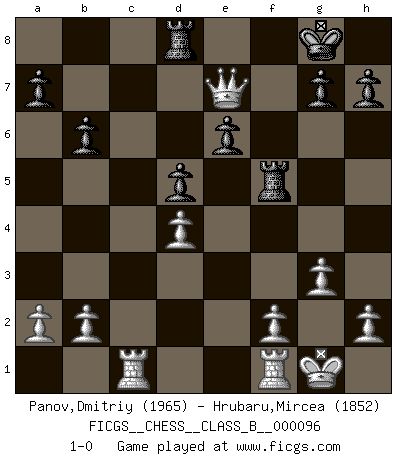 Last move : 1-0 2010 March 14 15:39:6 [Event "FICGS__CHESS__CLASS_B__000096"] [Site "FICGS"] [Date "2010.01.03"] [Round "1"] [White "Panov,Dmitriy"] [Black "Hrubaru,Mircea"] [Result "1-0"] [WhiteElo "1965"] [BlackElo "1852"] 1.e4 c5 2.c3 Nf6 3.e5 Nd5 4.d4 cxd4 5.cxd4 e6 6.Nf3 b6 7.Bd3 Bb4+ 8.Bd2 Bxd2+ 9.Nbxd2 Ba6 10.Ne4 O-O 11.O-O Bxd3 12.Qxd3 Nc6 13.Rac1 f6 14.g3 Qe8 15.exf6 Nxf6 16.Ne5 Nxe4 17.Qxe4 d5 18.Qe3 Nxe5 19.Qxe5 Rf5 20.Qd6 Rd8 21.Qa3 Qe7 22.Qxe7 1-0 Sicilian : Alapin's variation (2.c3) Kingside Castling by player Black (move 10) Kingside Castling by player White (move 11) Player White won this chess game. Follow this game move after move (download)I'm not afraid of Spassky. The world knows I'm the best. You don't need a match to prove it. (Bobby Fischer) Wenn es im Universum noch irgendwo intelligente Lebewesen gibt, dann kennen sie Go. (Emanuel Lasker) Bobby Fischer es el mas grande genio de Ajedrez de todos los tiempos. (Alexander Kotov) On est toujours la mazette de quelqu'un d'autre. (Anonyme) Luck is what you have left over after you give 100 percent. (Langston Coleman)