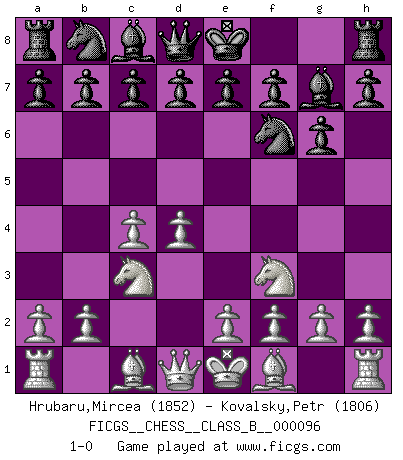 Last move : 1-0 2010 January 7 19:27:10 [Event "FICGS__CHESS__CLASS_B__000096"] [Site "FICGS"] [Date "2010.01.03"] [Round "1"] [White "Hrubaru,Mircea"] [Black "Kovalsky,Petr"] [Result "1-0"] [WhiteElo "1852"] [BlackElo "1806"] 1.d4 Nf6 2.c4 g6 3.Nf3 Bg7 4.Nc3 1-0 King's Indian, 3.Nf3 Player White won this chess game. Follow this game move after move (download)Chess is no whit inferior to the violin, and we have a large number of professional violinists. (Mikhail Botvinnik) Schach verlangt totale Konzentration. (Robert James Fischer) Siempre es mejor sacrificar los hombres de tu oponente. (Savielly Tartakower) Votre seul travail dans les ouvertures est d'obtenir un milieu de partie jouable. (Lajos Portish) The hypothalamus is one of the most important parts of the brain, involved in many kinds of motivation, among other functions. The hypothalamus controls the 'Four Fs: Fighting, Fleeing, Feeding and Mating. (Unknown author)