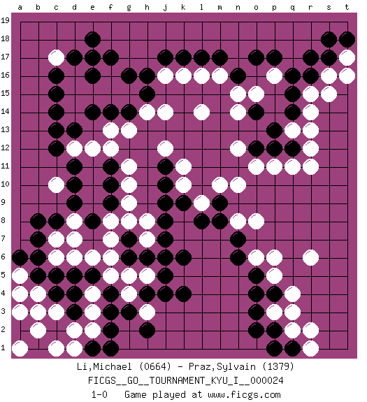 Last move : 1-0 2010 March 28 19:34:10 [Event "FICGS__GO__TOURNAMENT_KYU_I__000024"] [Site "FICGS"] [Date "2010.01.03"] [Round "1"] [Black "Li,Michael"] [White "Praz,Sylvain"] [Result "1-0"] [Rating 1 "0664"] [Rating 2 "1379"] 1.q16 e17 2.d4 q4 3.c16 d15 4.c15 d14 5.c13 l16 6.g16 h14 7.g14 g13 8.f14 f13 9.e16 d16 10.d17 f16 11.o3 r6 12.k4 c6 13.c8 e6 14.f4 c3 15.c4 b4 16.b5 b2 17.c5 a5 18.a6 a4 19.b6 e3 20.d3 d2 21.f3 e2 22.a2 b3 23.f2 e4 24.e5 f5 25.d5 f6 26.b1 d6 27.b7 c1 28.e1 a1 29.f17 e15 30.b1 c7 31.b8 a1 32.e18 c17 33.e16 f15 34.e17 g15 35.c14 h3 36.h4 r14 37.o17 q2 38.o5 s16 39.r17 r11 40.e8 d8 41.d9 f8 42.f9 g8 43.j7 g9 44.f10 g10 45.f11 g11 46.p2 p3 47.p4 q3 48.o2 h5 49.j4 p6 50.q12 r12 51.q14 r15 52.q15 q11 53.p12 p11 54.o12 o11 55.n7 o8 56.h16 l14 57.k17 p5 58.o4 e12 59.d13 f12 60.d11 d12 61.c12 o6 62.n6 o15 63.l17 m16 64.m17 n12 65.m9 q13 66.p13 r13 67.o14 n14 68.n16 n15 69.j9 j6 70.k6 h7 71.j8 k11 72.h15 j14 73.e14 p16 74.p17 n8 75.m8 n10 76.q1 r1 77.p1 r2 78.s17 g4 79.g3 g5 80.h2 t17 81.t18 t16 82.s18 m10 83.r16 s15 84.j11 k10 85.j10 j12 86.j5 l9 87.l8 k16 88.h6 j16 89.j17 d1 90.f1 a3 91.g7 h8 92.g6 f7 93.j6 d7 94.k9 c10 95.d10 1-0 Here are the names of the openings (joseki) played in the four corners : Corner d16 : e17 c16 Mokuhazushi (Waemok, Wai`mu`) 5-3 Point. The mokuhazushi (5-3) point was popular in the Edo period in Japan (1600 - 1867). It emphasizes influence; territorially, it is inferior to the 3-4 point. Komoku Kakari. Black 2 is the standard approach because of its solidity and stability. Corner q16 : q16 l16 Hoshi (Hwajeom, Seongjeom, Xingwei`) 4-4 Point. The star or hoshi (4-4) point, emphasizing influence at the potential expense of territory. Corner q4 : q4 o3 Hoshi (Hwajeom, Seongjeom, Xingwei`) 4-4 Point. The star or hoshi (4-4) point, emphasizing influence at the potential expense of territory. Ikken Kakari (Hankan Keolch'im, Yi Gua`jiao~, 1-Space Low Approach). Black 2 is the standard approach move to the 4-4. Corner d4 : d4 c6 Hoshi (Hwajeom, Seongjeom, Xingwei`) 4-4 Point. The star or hoshi (4-4) point, emphasizing influence at the potential expense of territory. Ikken Kakari (Hankan Keolch'im, Yi Gua`jiao~, 1-Space Low Approach). White 2 is the standard approach move to the 4-4. Player Black won this Go (weiqi, baduk) game. Follow this game move after move (download)There is death in the hane. (Anonymous) Horse racing is animated roulette. (Roger Kahn)