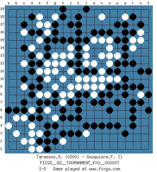 Last move : 1-0 2006 November 18 21:38:55 [Event "FICGS__GO__TOURNAMENT_KYU__000007"] [Site "FICGS"] [Date "2006.10.14"] [Round "1"] [Black "Tarassov,Sergey"] [White "Souquiere,Florence"] [Result "1-0"] [Rating 1 "0300"] 1.q16 d4 2.d16 q4 3.r6 c9 4.o4 o5 5.p4 p5 6.r4 q5 7.q3 g3 8.k3 c12 9.k16 k4 10.j3 j4 11.l4 l5 12.m4 m5 13.n4 n5 14.q10 e15 15.e16 c16 16.c17 q6 17.r7 k10 18.c7 g11 19.d5 q7 20.q8 r8 21.r9 s8 22.r5 q9 23.p9 p8 24.s9 t9 25.s7 q9 26.c3 h2 27.h3 s10 28.q8 t7 29.t8 p10 30.p11 o10 31.o9 n9 32.o11 n10 33.o8 o7 34.n8 m8 35.m7 l7 36.l8 m9 37.n7 l6 38.k8 q11 39.q12 r11 40.r12 l13 41.l11 n6 42.p7 o14 43.o16 l10 44.m11 n11 45.n12 l9 46.j7 k9 47.h6 o12 48.p12 o13 49.q14 h4 50.g4 g5 51.f4 r10 52.q9 j8 53.k7 h8 54.h5 p6 55.k5 p8 56.k6 j9 57.j12 m12 58.k12 m10 59.g7 n13 60.k14 e8 61.e7 f8 62.g8 g9 63.f7 l12 64.k11 h13 65.k13 j11 66.g15 j14 67.j15 h12 68.f14 g13 69.f13 g12 70.e12 t10 71.t6 m6 72.e10 e11 73.d11 f11 74.d12 l14 75.l15 j13 76.k15 d10 77.d9 n15 78.n16 o15 79.d8 f10 80.c10 p13 81.q13 f12 82.e9 m15 83.m16 p16 84.p17 r15 85.r16 s16 86.s17 h16 87.h15 j18 88.j17 h17 89.k18 j16 90.k17 r14 91.s11 s8 92.t11 r17 93.r18 h10 94.p7 h7 95.o6 s15 96.h18 k19 97.l19 j19 98.q15 g18 99.h19 e13 100.d13 d6 101.c6 c5 102.e5 d14 103.c14 l3 104.j5 n18 105.p15 f17 106.g16 q18 107.q17 d3 108.c4 c2 109.f3 b3 110.b4 b5 111.b6 a4 112.e2 d2 113.g2 f6 114.e6 e1 115.f1 d1 116.a6 e18 117.d18 f16 118.f15 e17 119.g17 e3 120.f2 1-0 Here are the names of the openings (joseki) played in the four corners : Corner q4 : q4 r6 Hoshi (Hwajeom, Seongjeom, Xingwei`) 4-4 Point. The star or hoshi (4-4) point, emphasizing influence at the potential expense of territory. Ikken Kakari (Hankan Keolch'im, Yi Gua`jiao~, 1-Space Low Approach). Black 2 is the standard approach move to the 4-4. Corner d16 : d16 c12 Hoshi (Hwajeom, Seongjeom, Xingwei`) 4-4 Point. The star or hoshi (4-4) point, emphasizing influence at the potential expense of territory. Player Black won this Go (weiqi, baduk) game. Follow this game move after move (download)Six eyes in a rectangle are alive. (Anonymous) The only thing that overcomes hard luck is hard work. (Harry Golden)