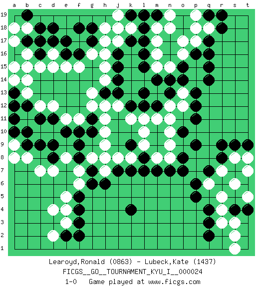 Last move : 1-0 2010 March 26 17:8:24 [Event "FICGS__GO__TOURNAMENT_KYU_I__000024"] [Site "FICGS"] [Date "2010.01.03"] [Round "1"] [Black "Learoyd,Ronald"] [White "Lubeck,Kate"] [Result "1-0"] [Rating 1 "0863"] [Rating 2 "1437"] 1.q16 d4 2.q3 d16 3.r9 c10 4.f4 e5 5.k4 o17 6.l17 p15 7.q15 p14 8.q14 q18 9.p13 o13 10.p12 j17 11.l15 h15 12.p16 o16 13.o15 n15 14.o14 m16 15.l16 m17 16.l13 j12 17.j14 h14 18.j13 h12 19.k12 r5 20.p5 s3 21.q7 h7 22.k7 c15 23.r18 p17 24.q17 p18 25.n14 m15 26.m14 e4 27.f3 s2 28.s7 s6 29.t4 t5 30.s4 r4 31.e10 h9 32.c9 d10 33.d9 e11 34.f10 f11 35.g10 h10 36.g11 g12 37.d11 d12 38.c11 c12 39.b10 d7 40.f5 f6 41.g6 f7 42.g7 g8 43.h6 e3 44.e2 d2 45.f2 l9 46.j7 h8 47.q4 r3 48.q2 s1 49.f8 e8 50.f9 h11 51.d8 c7 52.b12 b13 53.a11 l10 54.h13 g13 55.l18 m18 56.g17 h17 57.g18 h18 58.d18 c17 59.c18 b18 60.d17 g16 61.b17 b16 62.c16 a17 63.c17 b15 64.e16 d15 65.f16 f15 66.b19 a18 67.f18 e15 68.e17 n9 69.n7 n12 70.p9 n11 71.p11 k11 72.l12 l11 73.n13 o12 74.j15 k18 75.m19 n19 76.l19 n18 77.j16 h16 78.o8 b8 79.b9 a9 80.a10 a8 81.a13 b14 82.l7 q6 83.p6 r7 84.r8 s8 85.s9 t7 86.t9 t8 87.m12 m11 88.k17 j19 89.k19 j18 90.a16 a15 91.k9 k8 92.l8 j8 93.o10 n10 94.q19 p19 95.r19 m8 96.m7 n8 97.o7 a14 98.a12 1-0 Here are the names of the openings (joseki) played in the four corners : Corner d4 : d4 f4 Hoshi (Hwajeom, Seongjeom, Xingwei`) 4-4 Point. The star or hoshi (4-4) point, emphasizing influence at the potential expense of territory. Ikken Takagakari (Hankan Nop'dakeolch'im, Yi Gaojia, 1-Space High Approach). White typically responds at 6-4 or 3-10. White 4-10 is played when White finds play on the right side advantageous. White 4-8 or 3-8 may be played when White has support at top. Corner q16 : q16 o17 Hoshi (Hwajeom, Seongjeom, Xingwei`) 4-4 Point. The star or hoshi (4-4) point, emphasizing influence at the potential expense of territory. Ikken Kakari (Hankan Keolch'im, Yi Gua`jiao~, 1-Space Low Approach). White 2 is the standard approach move to the 4-4. Player Black won this Go (weiqi, baduk) game. Follow this game move after move (download)Answer the keima with a kosumi. (Anonymous) Warrior pose battles inner weakness and wins focus. You see that there is no war within you. You're on your own side, and you are your own strength. (Terri Guillemets)