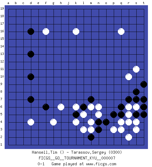 Last move : 0-1 2006 December 20 19:32:52 [Event "FICGS__GO__TOURNAMENT_KYU__000007 "] [Site "FICGS"] [Date "2006.10.14"] [Round "1"] [Black "Hansell,Tim "] [White "Tarassov,Sergey "] [Result "0-1"] [Rating 2 "0300"] 1.d16 q4 2.p5 q16 3.o4 r6 4.q6 d4 5.r7 r5 6.s8 f16 7.q5 p3 8.r4 s4 9.d10 k16 10.d13 k4 11.d7 g4 12.t7 r10 13.f6 h6 14.r3 s3 15.s5 s6 16.t5 r2 17.t6 q3 18.s7 r4 19.t9 s11 20.n3 m3 21.m2 m4 22.n4 n6 23.m5 n5 24.l4 l3 25.k5 l5 26.l6 m6 27.m7 k6 0-1 This go game has been lost on time (started : 2006.10.14 13:41:33) Here are the names of the openings (joseki) played in the four corners : Corner q4 : q4 p5Hoshi (Hwajeom, Seongjeom, Xingwei`) 4-4 Point. The star or hoshi (4-4) point, emphasizing influence at the potential expense of territory. Corner d16 : d16 f16Hoshi (Hwajeom, Seongjeom, Xingwei`) 4-4 Point. The star or hoshi (4-4) point, emphasizing influence at the potential expense of territory.Ikken Takagakari (Hankan Nop'dakeolch'im, Yi Gaojia, 1-Space High Approach). Black typically responds at 6-4 or 3-10. Black 4-10 is played when Black finds play on the right side advantageous. Black 4-8 or 3-8 may be played when Black has support at top. Corner d4 : d4 d7Hoshi (Hwajeom, Seongjeom, Xingwei`) 4-4 Point. The star or hoshi (4-4) point, emphasizing influence at the potential expense of territory.Nikken Takagakari (Dukan Nop'dakeolch'im, E`r Gaojia, 2-Space High Approach). Black 2 is a light approach move. Rarely played in even games, Black 2 is typically employed in handicap games. White continues with 6-4 or 3-10. In Korean Sunjang Baduk White has a stone on 8-4. Player White won this Go (weiqi, baduk) game.Follow this game move after move (download ) In the opening, when you don't know what to play, make a shimari. (Jansteen) A person who never made a mistake never tried anything new. (Albert Einstein)