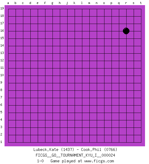 Last move : 1-0 2010 February 3 8:14:27 [Event "FICGS__GO__TOURNAMENT_KYU_I__000024"] [Site "FICGS"] [Date "2010.01.03"] [Round "1"] [Black "Lubeck,Kate"] [White "Cook,Phil"] [Result "1-0"] [Rating 1 "1437"] [Rating 2 "0766"] 1.r16 1-0 This go game has been lost on time (started : 2010.01.03 19:36:55) Here are the names of the openings (joseki) played in the four corners : Player Black won this Go (weiqi, baduk) game. Follow this game move after move (download)Beginner's games are surprising, often incoherent and incomprehensible. When you improve, your game gains in consistency but flirts with stupidity: you become satisfied with truisms and mechanical movements, you try to obtain a feeling for clearness and style the easy way. (Pierre Audouard) Always be a first-rate version of yourself, instead of a second-rate version of somebody else. (Judy Garland)