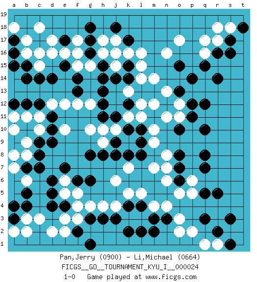 Last move : 1-0 2010 March 24 3:39:34 [Event "FICGS__GO__TOURNAMENT_KYU_I__000024"] [Site "FICGS"] [Date "2010.01.03"] [Round "1"] [Black "Pan,Jerry"] [White "Li,Michael"] [Result "1-0"] [Rating 1 "0900"] [Rating 2 "0664"] 1.d4 q16 2.q3 d16 3.r5 l3 4.r14 o3 5.p14 o17 6.s16 r17 7.q10 p5 8.q7 f3 9.d6 d2 10.j3 k5 11.m3 m4 12.n3 n4 13.l2 k3 14.k2 o2 15.m3]] j4 16.h3 h4 17.g3 g4 18.f2 e3 19.m2 e2 20.g1 c3 21.c14 c10 22.c8 e10 23.b4 c15 24.d14 f16 25.c12 e12 26.f14 h16 27.b10 b9 28.c9 b11 29.d10 c11 30.d11 d12 31.b12 a10 32.d9 b8 33.b7 a8 34.h14 g12 35.k14 k16 36.c17 c16 37.f13 f12 38.e17 d17 39.g17 f17 40.g16 g15 41.h15 h17 42.h12 g10 43.g8 h9 44.h8 k9 45.j9 j10 46.j8 l11 47.h11 h10 48.l8 m14 49.m13 l14 50.l13 n13 51.m11 k13 52.k12 j13 53.h13 j12 54.j11 l12 55.j14 m12 56.k10 k11 57.l10 k13 58.a12 a11 59.b15 b16 60.b14 e5 61.d5 m10 62.l9 n11 63.q12 n8 64.o15 n16 65.k15 l15 66.j16 j17 67.k17 l16 68.g18 f15 69.j18 j15 70.e15 e16 71.j16 k7 72.k8 j15 73.l4 j16 74.k4 l5 75.o10 m9 76.s17 s18 77.r16 q17 78.t18 r18 79.q5 p6 80.q8 m7 81.e4 f4 82.f6 f5 83.g6 j6 84.a16 b17 85.a17 a18 86.a15 c18 87.o7 n7 88.o6 o5 89.o8 n6 90.o13 b6 91.c7 a7 92.b5 r1 93.r2 q1 94.s1 p2 95.s3 b3 96.a3 a2 97.a4 b2 98.q15 o12 99.p12 o11 100.p11 e6 101.e7 1-0 Here are the names of the openings (joseki) played in the four corners : Corner q16 : q16 r14 Hoshi (Hwajeom, Seongjeom, Xingwei`) 4-4 Point. The star or hoshi (4-4) point, emphasizing influence at the potential expense of territory. Ikken Kakari (Hankan Keolch'im, Yi Gua`jiao~, 1-Space Low Approach). Black 2 is the standard approach move to the 4-4. Corner d4 : d4 f3 Hoshi (Hwajeom, Seongjeom, Xingwei`) 4-4 Point. The star or hoshi (4-4) point, emphasizing influence at the potential expense of territory. Ikken Kakari (Hankan Keolch'im, Yi Gua`jiao~, 1-Space Low Approach). White 2 is the standard approach move to the 4-4. Corner d16 : d16 c14 Hoshi (Hwajeom, Seongjeom, Xingwei`) 4-4 Point. The star or hoshi (4-4) point, emphasizing influence at the potential expense of territory. Ikken Kakari (Hankan Keolch'im, Yi Gua`jiao~, 1-Space Low Approach). Black 2 is the standard approach move to the 4-4. Player Black won this Go (weiqi, baduk) game. Follow this game move after move (download)It is difficult to know exactly what you are doing. (Pierre Audouard) Some people are so afraid to die that they never begin to live. (Henry Van Dyke)