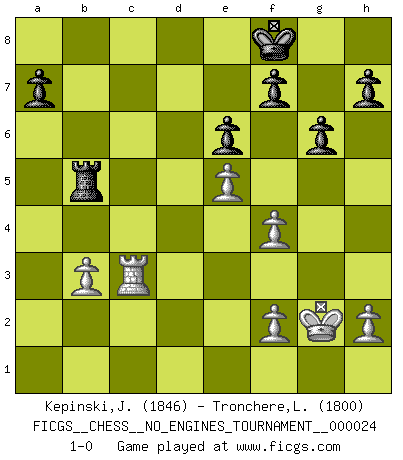 Last move : 1-0 2010 June 28 9:6:56 [Event "FICGS__CHESS__NO_ENGINES_TOURNAMENT__000024"] [Site "FICGS"] [Date "2010.01.04"] [Round "1"] [White "Kepinski,Janusz"] [Black "Tronchere,Laurent"] [Result "1-0"] [WhiteElo "1846"] [BlackElo "1800"] 1.d4 Nf6 2.c4 g6 3.Nf3 Bg7 4.e3 O-O 5.Bd3 c5 6.O-O cxd4 7.exd4 d5 8.Nc3 dxc4 9.Bxc4 Nbd7 10.Re1 Nb6 11.Bb3 Nfd5 12.Be3 Bf5 13.Nxd5 Nxd5 14.Bxd5 Qxd5 15.b3 Rfd8 16.Rc1 Rac8 17.Rxc8 Rxc8 18.Nh4 Be6 19.Nf3 Bg4 20.Bf4 e6 21.Be5 Bxf3 22.Qxf3 Qxf3 23.gxf3 Bxe5 24.dxe5 Rc2 25.a4 Rc3 26.Re3 Rc5 27.Kg2 Kf8 28.f4 b5 29.axb5 Rxb5 30.Rc3 1-0 This chess game has been lost on time (started : 2010.01.04 23:27:50) King's Indian, 3.Nf3 Kingside Castling by player Black (move 4) Kingside Castling by player White (move 6) Player White won this chess game. Follow this game move after move (download)Chess books should be used as we use glasses: to assist the sight, although some players make use of them as if they thought they conferred sight. (Jose Raul Capablanca) Gegen einen Schachcomputer zu verlieren ist wie Löcher in den Strümpfen zuhaben. Es ist nicht peinlich, solange man der einzige ist der es weiß. (Anonymous) Es muy difícil jugar en contra de la teoría de Einstein. - en su primera derrota en contra de Fischer (Mikhail Tal) Les Echecs sont et restent toujours un combat, un combat intégral comme la boxe, la lutte ou un autre sport, et où il doit y avoir un vainqueur et un vaincu. (Joseph Emil Diemer) Statistics can be made to prove anything - even the truth. (Author unknown)