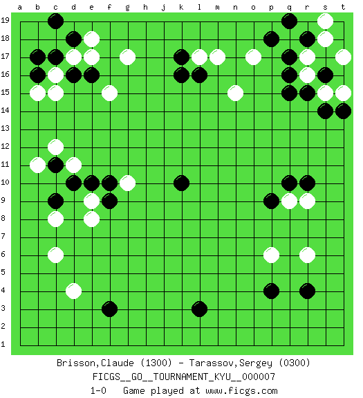 Last move : 1-0 2006 October 24 16:10:56 [Event "FICGS__GO__TOURNAMENT_KYU__000007"] [Site "FICGS"] [Date "2006.10.14"] [Round "1"] [Black "Brisson,Claude"] [White "Tarassov,Sergey"] [Result "1-0"] [Rating 1 "1300"] [Rating 2 "0300"] 1.q16 d4 2.r4 c16 3.f3 c6 4.l3 d11 5.q10 o17 6.k17 l17 7.k16 g17 8.l16 m17 9.k10 r6 10.p4 r9 11.r10 q9 12.p9 p6 13.c9 e9 14.c11 c12 15.d10 b11 16.e10 g10 17.f9 e8 18.f10 c8 19.e16 f15 20.c17 d17 21.d16 e17 22.b16 c15 23.b17 b15 24.d18 e18 25.c19 r17 26.q17 r16 27.q15 n15 28.r15 q18 29.p18 s15 30.s14 t15 31.t14 t17 32.r18 s18 33.q19 s19 34.s16 1-0 Here are the names of the openings (joseki) played in the four corners : Corner d4 : d4 f3 Hoshi (Hwajeom, Seongjeom, Xingwei`) 4-4 Point. The star or hoshi (4-4) point, emphasizing influence at the potential expense of territory. Ikken Kakari (Hankan Keolch'im, Yi Gua`jiao~, 1-Space Low Approach). Black 2 is the standard approach move to the 4-4. Corner q16 : q16 o17 Hoshi (Hwajeom, Seongjeom, Xingwei`) 4-4 Point. The star or hoshi (4-4) point, emphasizing influence at the potential expense of territory. Ikken Kakari (Hankan Keolch'im, Yi Gua`jiao~, 1-Space Low Approach). White 2 is the standard approach move to the 4-4. Player Black won this Go (weiqi, baduk) game. Follow this game move after move (download)Don't make compact groups of stones. (Anonymous) For to win one hundred victories in one hundred battles is not the acme of skill. To subdue the enemy without fighting is the acme of skill. (Sun Tzu)
