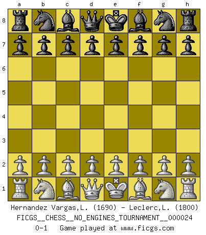 Last move : 0-1 2010 February 14 8:45:39 [Event "FICGS__CHESS__NO_ENGINES_TOURNAMENT__000024"] [Site "FICGS"] [Date "2010.01.04"] [Round "1"] [White "Hernandez Vargas,Leonel"] [Black "Leclerc,Luc-Olivier"] [Result "0-1"] [WhiteElo "1690"] [BlackElo "1800"] 0-1 This chess game has been lost on time (started : 2010.01.04 23:27:50) Player Black won this chess game. Follow this game move after move (download)A Chess game is divided into three stages: the first, when you hope you have the advantage, the second when you believe you have an advantage, and the third... when you know you're going to lose ! (Savielly Tartakower) Ich verachte die Medien. (Robert James Fischer) Existen dos clases de sacrificios: los correctos y los míos. (Mikhail Tal) Les échecs sont utiles à l'exercice de la faculté de penser et à celle de l'imagination. Car nous devons posséder une méthode élaborée pour atteindre des buts partout où nous devons conduire notre raison. (Leibnitz) The various flowers seem good to different people. (Chinese proverb)