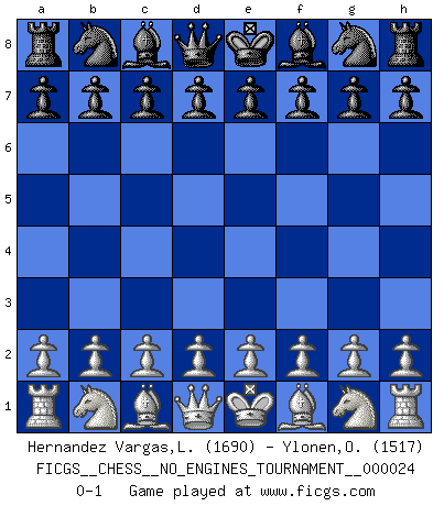 Last move : 0-1 2010 February 14 8:45:39 [Event "FICGS__CHESS__NO_ENGINES_TOURNAMENT__000024"] [Site "FICGS"] [Date "2010.01.04"] [Round "1"] [White "Hernandez Vargas,Leonel"] [Black "Ylonen,Olli"] [Result "0-1"] [WhiteElo "1690"] [BlackElo "1517"] 0-1 This chess game has been lost on time (started : 2010.01.04 23:27:50) Player Black won this chess game. Follow this game move after move (download)Pawns: they are the soul of this game, they alone form the attack and defense. (Philidor) Im Spitzenschach von heute geht es nur um Vorbereitung, um tiefgründige, sorgfältige Eröffnungsvorbereitung. (Nigel Short) El Ajedrez tiene tanto misterio como las mujeres. (Purdy) La tactique est l'élément le plus important du milieu de jeu. (Siegbert Tarrasch) First of all, we have to go back to the classical time control. (Anatoly Karpov)