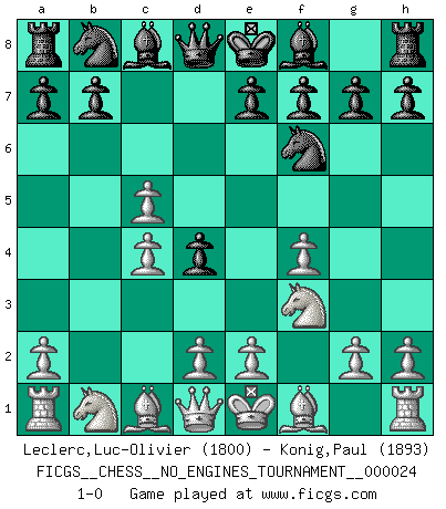 Last move : 1-0 2010 January 26 2:13:23 [Event "FICGS__CHESS__NO_ENGINES_TOURNAMENT__000024"] [Site "FICGS"] [Date "2010.01.04"] [Round "1"] [White "Leclerc,Luc-Olivier"] [Black "Konig,Paul"] [Result "1-0"] [WhiteElo "1800"] [BlackElo "1893"] 1.f4 d5 2.Nf3 c5 3.c4 d4 4.b4 Nf6 5.bxc5 1-0 Bird's Opening Player White won this chess game. Follow this game move after move (download)Weak points or holes in the opponent's position must be occupied by pieces not Pawns. (Siegbert Tarrasch) Fallen sollten polizeilich verboten werden. (Savielly Grigorievitsch Tartakower) Mi estilo es algo parecido entre un poco de Tal y Petrosian. (Reshevsky) Celui qui prend des risques peut perdre, celui qui n'en prend pas perd toujours. (Xavier Tartacover) Whenever people agree with me, I always feel I must be wrong. (Oscar Wilde)