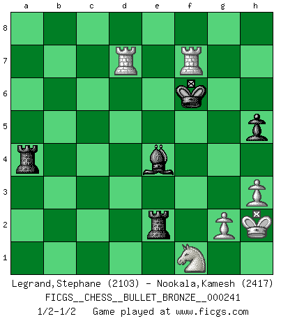 Last move : 1/2-1/2 2010 April 22 20:51:32 [Event "FICGS__CHESS__BULLET_BRONZE__000241"] [Site "FICGS"] [Date "2010.04.22"] [Round "1"] [White "Legrand,Stephane"] [Black "Nookala,Kamesh"] [Result "1/2-1/2"] [WhiteElo "2103"] [BlackElo "2417"] 1.d4 d5 2.c4 c6 3.Nf3 Nf6 4.e3 e6 5.Bd3 Nbd7 6.O-O Bd6 7.Nc3 O-O 8.e4 dxc4 9.Bxc4 e5 10.h3 b5 11.Bb3 Qc7 12.a3 exd4 13.Nxd4 Nc5 14.Be3 Nxb3 15.Qxb3 a6 16.f4 c5 17.Ndxb5 axb5 18.e5 Bxe5 19.Nxb5 Qc6 20.fxe5 Bb7 21.Rf2 Ne4 22.Rc2 Ba6 23.Nc3 Rfb8 24.Qd5 Qxd5 25.Nxd5 Bd3 26.R2c1 Rxb2 27.Bxc5 Nxc5 28.Rxc5 Be4 29.Ne3 h5 30.Rc4 Bb7 31.Rc7 Be4 32.Rc4 Bd3 33.Rd4 Ba6 34.Re1 Rc8 35.Rd6 Bb7 36.e6 fxe6 37.Rxe6 Rc5 38.Re8+ Kf7 39.Rb8 Kg6 40.a4 Ra5 41.Rd1 Rxa4 42.Rd7 Rb1+ 43.Kh2 Be4 44.Rg8 Kf6 45.R8xg7 Re1 46.Nf1 Re2 47.Rgf7+ Ke6 48.Rfe7+ Kf6 49.Rf7+ 1/2-1/2 QGD Slav : 4.e3 Kingside Castling by player White (move 6) Kingside Castling by player Black (move 7) This chess game ended in a draw. Follow this game move after move (download)If one piece is badly posted, the whole game is bad. (Tarrasch) Ivan Sokolov treibt mich als Beifahrer an mit go Loeky go - . (Loek van Wely) Uno por uno, yo los acribillé, mi superioridad muy pronto se volvio aparente. (Jose Capablanca) Les Echecs sont et restent toujours un combat, un combat intégral comme la boxe, la lutte ou un autre sport, et où il doit y avoir un vainqueur et un vaincu. (Joseph Emil Diemer) Think like a man of action, act like a man of thought. (Henri Louis Bergson)