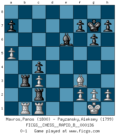 Last move : 0-1 2010 January 9 14:54:3 [Event "FICGS__CHESS__RAPID_B__000136"] [Site "FICGS"] [Date "2010.01.05"] [Round "1"] [White "Mavros,Panos"] [Black "Payzansky,Aleksey"] [Result "0-1"] [WhiteElo "1800"] [BlackElo "1799"] 1.d4 Nf6 2.c4 g6 3.Nc3 d5 4.Nf3 Bg7 5.Qb3 dxc4 6.Qxc4 O-O 7.e4 Nc6 8.Be2 e5 9.d5 Nd4 10.Nxd4 exd4 11.Qxd4 c6 12.Bg5 Nxe4 13.Qxg7+ Kxg7 14.Bxd8 Nxc3 15.bxc3 Rxd8 16.dxc6 bxc6 17.O-O Be6 18.a3 Rab8 19.a4 Rb3 20.Rfc1 Rd2 21.Bf3 c5 22.a5 c4 23.Rab1 Rc2 0-1 King's Indian defense, 3.Nc3 Kingside Castling by player Black (move 6) Kingside Castling by player White (move 17) Player Black won this chess game. Follow this game move after move (download)The sign of a great Master is his ability to win a won game quickly and painlessly. (Irving Chernev) Ein Schachgenie ist jemand der verdammt gut Schach spielt. (Jonathan Levitt) Tu sabes que vas a perder. Aún cuando tenía la ventaja, yo sabía que iba a perder. - al estar jugando con Fischer (Andrew Soltis) Toute estimation doit être constamment réévaluée. (Jacob Estrin) If we don't succeed, we run the risk of failure. (George W. Bush)