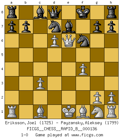 Last move : 1-0 2010 February 7 4:57:20 [Event "FICGS__CHESS__RAPID_B__000136"] [Site "FICGS"] [Date "2010.01.05"] [Round "1"] [White "Eriksson,Joel"] [Black "Payzansky,Aleksey"] [Result "1-0"] [WhiteElo "1725"] [BlackElo "1799"] 1.e4 c5 2.a3 Nc6 3.b4 cxb4 4.axb4 Nxb4 5.d4 e6 6.c3 Nc6 7.Na3 d6 8.d5 Ne5 9.f4 Nd7 10.Nb5 exd5 11.exd5 Ngf6 12.Qe2+ Be7 13.Nxd6+ Kf8 14.Nxf7 Kxf7 15.Qe6+ Kf8 16.d6 1-0 Sicilian defense Player White won this chess game. Follow this game move after move (download)As one by one I mowed them down, my superiority soon became apparent. (Jose Capablanca) Wenn ein Kopf und ein Buch zusammenstoßen und es klingt hohl, ist es denn allemal im Buche? (Georg Christoph Lichtenberg) Al jugar al Ajedrez entonces, podemos aprender: Primero: Previsión... Segundo: Prudencia... Tercero: Cautela... Y al final, aprendemos del Ajedrez el hábito de no ser desanimados por apariencias malas presentes en el estado de nuestros asuntos, el hábito de la esperanza por una oportunidad favorable y la perseveración de los secretos de los recursos. (Benjamin Franklin) Votre prénom est 'Tactique', votre deuxième prénom est 'Tactique' et votre nom est 'Tactique'. (Ken Smith) You can think I'm wrong, but that's no reason to quit thinking. (Gregory House, House M.D.)