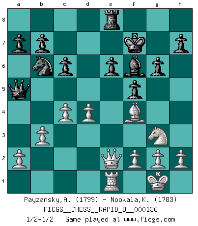 Last move : 1/2-1/2 2010 January 8 11:44:44 [Event "FICGS__CHESS__RAPID_B__000136"] [Site "FICGS"] [Date "2010.01.05"] [Round "1"] [White "Payzansky,Aleksey"] [Black "Nookala,Kamesh"] [Result "1/2-1/2"] [WhiteElo "1799"] [BlackElo "1783"] 1.e4 c6 2.d4 d5 3.Nc3 dxe4 4.Nxe4 Nd7 5.Bc4 Nb6 6.Bb3 Nf6 7.Qd3 g6 8.Nxf6+ exf6 9.Ne2 Bf5 10.Qe3+ Be7 11.Ng3 Bd7 12.O-O O-O 13.Re1 Re8 14.Qf3 f5 15.c3 Bf6 16.Bf4 Be6 17.Bxe6 Rxe6 18.Rxe6 fxe6 19.Qe2 Qd5 20.b3 Kf7 21.Rd1 Qa5 22.c4 Rd8 23.Re1 Re8 1/2-1/2 Caro-Kann : Steinitz variation Kingside Castling by player White (move 12) Kingside Castling by player Black (move 12) This chess game ended in a draw. Follow this game move after move (download)All that matters on the Chessboard is good moves. (Bobby Fischer) Wer wird heute Abend ihr Gegner sein? -- Heute Abend spiele ich gegen die schwarzen Steine. (Akiba Rubinstein) En el Ajedrez, tal como en la vida, las bendiciones de hoy pueden ser el veneno del mañana. (Assaic) Il n'y a plus de joueurs du niveau de Jacob Murray dont la seule quête est le beau jeu, le plaisir de voir les pièces construire quelque chose. Sur 10 idées à la minute, 9 seront sans intérêt, la dernière s'avèrera géniale. (Christian Bauer) There are more things in heaven and earth than practically anywhere else. (Unknown)