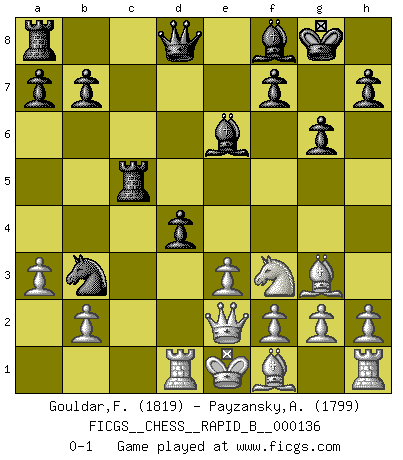 Last move : 0-1 2010 January 12 15:9:38 [Event "FICGS__CHESS__RAPID_B__000136"] [Site "FICGS"] [Date "2010.01.05"] [Round "1"] [White "Gouldar,Frances"] [Black "Payzansky,Aleksey"] [Result "0-1"] [WhiteElo "1819"] [BlackElo "1799"] 1.d4 Nf6 2.c4 g6 3.Nc3 d5 4.cxd5 Nxd5 5.Nxd5 Qxd5 6.Bf4 Nc6 7.Bxc7 e5 8.a3 exd4 9.Nf3 Bg7 10.Bg3 O-O 11.Qd2 Bf5 12.Nh4 Be6 13.Nf3 Na5 14.Qb4 Rfc8 15.e3 Nb3 16.Rd1 Bf8 17.Qb5 Rc5 18.Qe2 Qd8 0-1 King's Indian defense, 3.Nc3 Kingside Castling by player Black (move 10) Player Black won this chess game. Follow this game move after move (download)Could we look into the head of a Chess player, we should see there a whole world of feelings, images, ideas, emotion and passion. (Alfred Binet) Der zweitbeste Zug ist oft der einzig richtige. (Savielly Grigorievitsch Tartakower) La estratégia requiere pensar, la táctica requiere observación. (Max Euwe) Un millionnaire : 'Monsieur Steinitz ! Vous ne participez aux tournois que pour l'argent, alors que moi je n'y viens que pour l'honneur.' Steinitz : 'Chacun joue pour ce qu'il n'a pas'... Remember : Your focus determines your reality. (Qui-Gon Jinn in Star Wars ep.1)