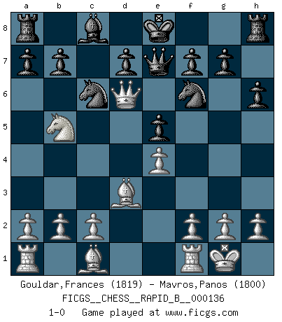 Last move : 1-0 2010 January 10 11:39:56 [Event "FICGS__CHESS__RAPID_B__000136"] [Site "FICGS"] [Date "2010.01.05"] [Round "1"] [White "Gouldar,Frances"] [Black "Mavros,Panos"] [Result "1-0"] [WhiteElo "1819"] [BlackElo "1800"] 1.e4 c5 2.Nf3 Nc6 3.d4 cxd4 4.Nxd4 Nf6 5.Nc3 e5 6.Ndb5 h6 7.Nd6+ Bxd6 8.Qxd6 Nd4 9.Bd3 Nc6 10.O-O Qe7 11.Nb5 1-0 Sicilian : Pelikan (Lasker/Sveshnikov) variation Kingside Castling by player White (move 10) Player White won this chess game. Follow this game move after move (download)I'm not afraid of Spassky. The world knows I'm the best. You don't need a match to prove it. (Bobby Fischer) Ohne Fehler kann es keine Brillanz geben. (Emanuel Lasker) Aunque la mayoría de la gente disfruta observar las partidas de los grandes Maestros de ataque, algunos de los jugadores mas notables en la historia han sido los jugadores silenciosos posicionales. Lentamente ellos te aplastan despojandote de tu espacio, congestionando tus piezas y dejandote virtualmente sin nada que hacer. (Yasser Seirawan) Assurément je connaissais par expérience le mystérieux attrait de ce jeu royal, le seul entre tous les jeux inventés par les hommes qui échappe souverainement à la tyrannie du hasard, le seul où l'on ne doive sa victoire qu'à son intelligence ou plutôt à une certaine forme d'intelligence. Mais n'est-ce pas déjà le limiter injurieusement que d'appeler les échecs un jeu ? N'est-ce pas une science, un art ou quelque chose qui, comme le cercueil de Mahomet entre ciel et terre, est suspendu entre l'un et l'autre, et qui réunit un nombre incroyable de contraires ? [...] C'est une pensée qui ne mène à rien, une mathématique qui n'établit rien, un art qui ne laisse pas d'uvre, une architecture sans matière; et il l'a prouvé néanmoins qu'il était plus durable, à sa manière, que les livres ou que tout autre monument, ce jeu unique qui appartient à tous les peuples et à tous les temps, et dont personne ne sait quel dieu en fit don à la terre pour tuer l'ennui, pour aiguiser l'esprit et stimuler l'âme. Où commence-t-il, où finit-il ? (Stefan Zweig) Real knowledge is to know the extent of one's ignorance. (Confucius)