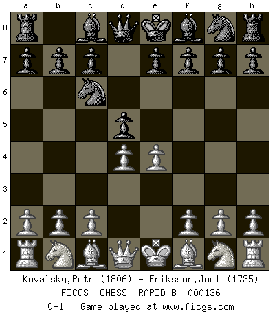Last move : 0-1 2010 January 7 19:27:23 [Event "FICGS__CHESS__RAPID_B__000136"] [Site "FICGS"] [Date "2010.01.05"] [Round "1"] [White "Kovalsky,Petr"] [Black "Eriksson,Joel"] [Result "0-1"] [WhiteElo "1806"] [BlackElo "1725"] 1.e4 Nc6 2.d4 d5 0-1 KP : Nimzovich defense Player Black won this chess game. Follow this game move after move (download)Before the endgame, the Gods have placed the middle game. (Siegbert Tarrasch) Auf jeden Fall musst du zuerst Rechtsanwalt werden, damit du deine eigenen Interessen und die deiner Familie vertreten kannst. [Brief an seinen Sohn] (José Raúl Capablanca) Yo no le temo a Spassky. Todos saben que yo soy el mejor. Uno no necesita un torneo para probarlo. (Bobby Fischer) La tactique est l'élément le plus important du milieu de jeu. (Siegbert Tarrasch) To be champion requires more than simply being a strong player; one has to be a strong human being as well. (Anatoly Karpov)