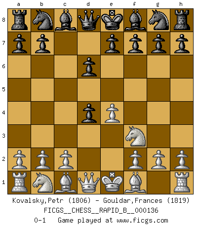 Last move : 0-1 2010 January 7 19:27:51 [Event "FICGS__CHESS__RAPID_B__000136"] [Site "FICGS"] [Date "2010.01.05"] [Round "1"] [White "Kovalsky,Petr"] [Black "Gouldar,Frances"] [Result "0-1"] [WhiteElo "1806"] [BlackElo "1819"] 1.e4 c5 2.Nf3 d6 3.d4 cxd4 0-1 Sicilian Player Black won this chess game. Follow this game move after move (download)Chess is really ninety nine percent calculation. (Soltis) Obwohl ich vom Stil her kaum zu den Priestern der Schachkunst gezählt werde, halte ich Schach doch für eine Kunst. (Tigran Petrosjan) Cuando la partida de Ajedrez termina, el Peón y el Rey regresan a la misma caja. (Irish saying) L'ordinateur a tué l'originalité. Il n'y a plus guère d'aventures sur l'échiquier. (Jacob Murray) The weakness of an artist is dogma. (Josh Waitzkin)
