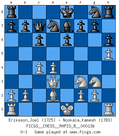 Last move : 0-1 2010 February 24 21:20:0 [Event "FICGS__CHESS__RAPID_B__000136"] [Site "FICGS"] [Date "2010.01.05"] [Round "1"] [White "Eriksson,Joel"] [Black "Nookala,Kamesh"] [Result "0-1"] [WhiteElo "1725"] [BlackElo "1783"] 1.e4 c6 2.d4 d5 3.Nc3 dxe4 4.Nxe4 Bf5 5.Ng3 Bg6 6.h4 h6 7.Nf3 Nd7 8.h5 Bh7 9.Bd3 Bxd3 10.Qxd3 e6 11.Bf4 Qa5+ 12.Bd2 Bb4 13.c3 Be7 14.c4 Qc7 0-1 This chess game has been lost on time (started : 2010.01.05 14:5:15) Caro-Kann : Classical, 7...Nd7 Player Black won this chess game. Follow this game move after move (download)It is not enough to be a good player... you must also play well. (Siegbert Tarrasch) Modernes Schach sorgt sich zuviel um Dinge wie Bauernstruktur usw. Vergessen Sie das, Schachmatt beendet das Spiel! (Nigel Short) Tu eres para mi la Reina en d8 y yo soy el Peón en d7!!. (GM Eduard Gufeld) Le temps de noter son nom sur la feuille de partie, j'étais déjà en zeitnot ! D'un modeste amateur apparié lors de la première ronde d'un open contre le grand-maître Azmaïparashvili. Man is still the most extraordinary computer of all. (John F. Kennedy)