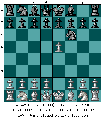 Last move : 1-0 2010 February 17 8:53:11 [Event "FICGS__CHESS__THEMATIC_TOURNAMENT__000102"] [Site "FICGS"] [Date "2010.01.07"] [Round "1"] [White "Parmet,Daniel"] [Black "Kopy,Adi"] [Result "1-0"] [WhiteElo "1983"] [BlackElo "1700"] 1.e4 Nf6 2.e5 1-0 This chess game has been lost on time (started : 2010.01.07 14:14:36) Alekhine's defense Player White won this chess game. Follow this game move after move (download)There is no remorse like the remorse of Chess. (H. G. Wells) Du kannst im Schach nur gut werden, wenn du das Spiel liebst. (Robert James Fischer) El Ajedrez es un juego terrible. Si no dominas el centro, tu oponente tiene una posición mas libre. Si tu tienes el centro, entonces realmente tienes algo de que preocuparte. (Siegbert Tarrasch) Les échecs sont un jeu par leur forme, un art par leur essence et une science par sa difficulté d'acquisition. Ils peuvent vous procurer autant de plaisir qu'un bon livre ou une belle musique, mais vous n'aurez une réelle joie que si vous arrivez à bien jouer. (Tigran Petrosian) In theory there is no difference between theory and practice. In practice there is. (Yogi Berra)