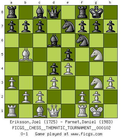 Last move : 0-1 2010 April 9 20:46:3 [Event "FICGS__CHESS__THEMATIC_TOURNAMENT__000102"] [Site "FICGS"] [Date "2010.01.07"] [Round "1"] [White "Eriksson,Joel"] [Black "Parmet,Daniel"] [Result "0-1"] [WhiteElo "1725"] [BlackElo "1983"] 1.e4 Nf6 2.Nc3 e5 3.a3 Nc6 4.Nf3 d5 5.Bb5 d4 6.Ne2 Bd6 7.d3 O-O 8.O-O Bg4 9.Ng3 Ne7 10.h3 Be6 11.Ng5 Bc8 0-1 This chess game has been lost on time (started : 2010.01.07 14:14:36) Alekhine's defense Kingside Castling by player Black (move 7) Kingside Castling by player White (move 8) Player Black won this chess game. Follow this game move after move (download)It is difficult to play against Einstein's theory --on his first loss to Fischer. (Mikhail Tal) Wenn man heute mit 14 Jahren noch kein GM ist, kann man es vergessen. (Viswanathan Anand) Por la belleza de sus partidas, la claridad de su juego y lo brillante de sus ideas, Fischer se creó el mismo como un artista de la misma estatura como Brahms, Rembrandt y Shakespeare. (David Levy) Les Echecs ne sont pas pour les âmes timides. Ils requièrent un homme entier, qui ne s'arrête pas aveuglément à ce qui a été déjà établi, mais qui tente individuellement de sonder les profondeurs du jeu. (W. Steinitz) Bobby never cared about money, though. His only desire was to prove that his choices were correct: He wanted chess to be important because he was a chess player, and he wanted to be important. Bobby knew money was important, but he didn't have a clue why, outside of clothes and status. The only way he could accomplish what he wanted was to fight for a lot of money. Once he got it, he gave it away. He did not know how to spend it. And once he'd become champion, after, essentially, sacrificing his life for it, he didn't know how to spend his time. (Bob Wade)