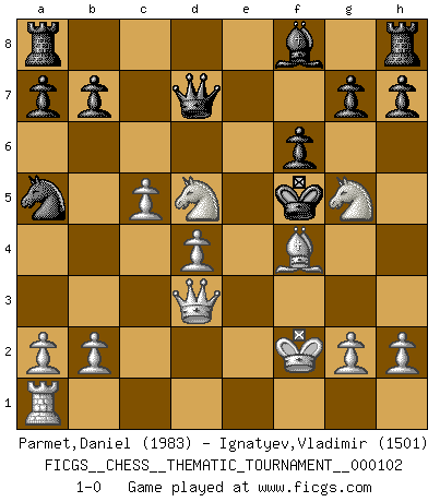 Last move : 1-0 2010 January 26 22:4:9 [Event "FICGS__CHESS__THEMATIC_TOURNAMENT__000102"] [Site "FICGS"] [Date "2010.01.07"] [Round "1"] [White "Parmet,Daniel"] [Black "Ignatyev,Vladimir"] [Result "1-0"] [WhiteElo "1983"] [BlackElo "1501"] 1.e4 Nf6 2.e5 Nd5 3.c4 Nb6 4.d4 d6 5.f4 f6 6.Nf3 dxe5 7.fxe5 Bg4 8.exf6 exf6 9.c5 Nd5 10.Bc4 Qe7+ 11.Kf2 c6 12.Re1 Be6 13.Qb3 Kf7 14.Rxe6 Kxe6 15.Bxd5+ cxd5 16.Nc3 Qd7 17.Bf4 Nc6 18.Nxd5 Na5 19.Ng5+ Kf5 20.Qd3+ 1-0 Alekhine's defense Player White won this chess game. Follow this game move after move (download)Your body has to be in top condition. Your Chess deteriorates as your body does. You can't separate body from mind. (Bobby Fischer) Mit Schach schule ich mein Gefühl für Geometrie, was für Tennis und Schach gleichermaßen wichtig ist. (Boris Becker) Yo adoro todas la posiciones. Denme una partida posicional difícil, y la jugaré. Pero posiciones totalmente ganadas, no las tolero. (Hein Donner) Votre prénom est 'Tactique', votre deuxième prénom est 'Tactique' et votre nom est 'Tactique'. (Ken Smith) When I took office, only high energy physicists had ever heard of what is called the World Wide Web... Now even my cat has its own page. (Bill Clinton, 1996)