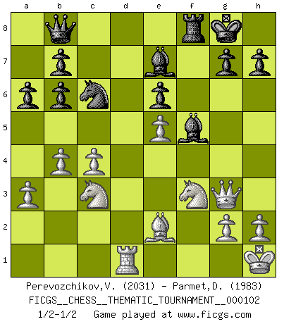 Last move : 1/2-1/2 2010 May 13 14:19:7 [Event "FICGS__CHESS__THEMATIC_TOURNAMENT__000102"] [Site "FICGS"] [Date "2010.01.07"] [Round "1"] [White "Perevozchikov,Vjacheslav"] [Black "Parmet,Daniel"] [Result "1/2-1/2"] [WhiteElo "2031"] [BlackElo "1983"] 1.e4 Nf6 2.e5 Nd5 3.c4 Nb6 4.d4 d6 5.f4 dxe5 6.fxe5 Nc6 7.Be3 Bf5 8.Nc3 e6 9.Nf3 Be7 10.Be2 O-O 11.O-O f6 12.Qe1 fxe5 13.dxe5 a6 14.Rd1 Qe8 15.Qg3 Rd8 16.Rxd8 Qxd8 17.Rd1 Qe8 18.a3 Na5 19.Bxb6 cxb6 20.b4 Nc6 21.Kh1 Qb8 1/2-1/2 Alekhine's defense Kingside Castling by player Black (move 10) Kingside Castling by player White (move 11) This chess game ended in a draw. Follow this game move after move (download)He who takes the Queen's Knight's Pawn will sleep in the streets. (Anonymous) Ich könnte leicht behaupten: Ja,ja, Leonid Breschnew wollte nicht, daß ich Weltmeister werde. In der Tat war die Sache komplizierter. (Viktor Kortschnoi) La única cosa que los jugadores de Ajedrez tienen en común, es el Ajedrez. (Lodewijk Prins) Mais l'homme est une créature légère et illogique : semblable au joueur d'échecs, il n'aime que le processus du but à atteindre, non le but lui-même. (Dostoïevsky) Big Chess is a place for big hallucinations. (Thibault de Vassal)