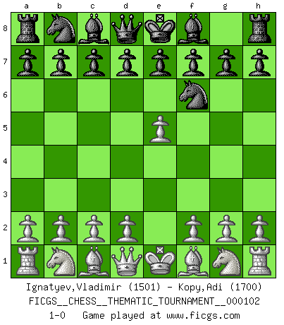 Last move : 1-0 2010 February 16 20:51:44 [Event "FICGS__CHESS__THEMATIC_TOURNAMENT__000102"] [Site "FICGS"] [Date "2010.01.07"] [Round "1"] [White "Ignatyev,Vladimir"] [Black "Kopy,Adi"] [Result "1-0"] [WhiteElo "1501"] [BlackElo "1700"] 1.e4 Nf6 2.e5 1-0 This chess game has been lost on time (started : 2010.01.07 14:14:36) Alekhine's defense Player White won this chess game. Follow this game move after move (download)Many Chess players were surprised when after the game, Fischer quietly explained: 'I had already analyzed this possibility' in a position which I thought was not possible to foresee from the opening. (Mikhail Tal) Wie kann ich Remis annehmen? Ich weiß ja gar nicht, wie ich stehe! (Fritz Sämisch) Sin errores no puede haber brillantez. (Emanuel Lasker) Le jeu d'échecs est comme rejeté hors du temps. (Antoine de Saint-Exupéry) All war is based on deception. (Sun Tzu)