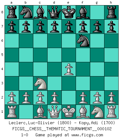 Last move : 1-0 2010 February 17 8:53:11 [Event "FICGS__CHESS__THEMATIC_TOURNAMENT__000102"] [Site "FICGS"] [Date "2010.01.07"] [Round "1"] [White "Leclerc,Luc-Olivier"] [Black "Kopy,Adi"] [Result "1-0"] [WhiteElo "1800"] [BlackElo "1700"] 1.e4 Nf6 2.Nc3 1-0 This chess game has been lost on time (started : 2010.01.07 14:14:36) Alekhine's defense Player White won this chess game. Follow this game move after move (download)Whoever sees no other aim in the game than that of giving checkmate to one's opponent will never become a good Chess player. (Euwe) Computer sind die einzigen Gegner, die nicht immer eine Ausrede auf Lager haben, wenn sie gegen mich verlieren. (Robert James Fischer) Si no le temes a Spassky, entonces elimino el elemento del dinero. (Jim Slater) Que feriez-vous si vous étiez en train de jouer aux échecs et que la fin du monde arrive ? Je continuerais à jouer. (Saint Borromée) A clear conscience is usually the sign of a bad memory. (Unknown)