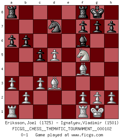Last move : 0-1 2010 April 1 8:25:33 [Event "FICGS__CHESS__THEMATIC_TOURNAMENT__000102"] [Site "FICGS"] [Date "2010.01.07"] [Round "1"] [White "Eriksson,Joel"] [Black "Ignatyev,Vladimir"] [Result "0-1"] [WhiteElo "1725"] [BlackElo "1501"] 1.e4 Nf6 2.Nc3 e5 3.a3 d5 4.exd5 Nxd5 5.Qh5 Nxc3 6.Qxe5+ Qe7 7.Qxe7+ Bxe7 8.dxc3 Bf5 9.Bd3 Be6 10.Bf4 c6 11.Nf3 Nd7 12.Nd4 Bd5 13.O-O O-O 14.c4 c5 15.Nf5 Bf6 16.cxd5 b6 17.c3 a6 0-1 This chess game has been lost on time (started : 2010.01.07 14:14:36) Alekhine's defense Kingside Castling by player White (move 13) Kingside Castling by player Black (move 13) Player Black won this chess game. Follow this game move after move (download)Best by test: 1. e4 (Bobby Fischer) Strategie ist, wie man ein Mädchen auf den Rücksitz bekommt. Taktik ist, was man tut, wenn man dann dort ist. (Anonymous) Una de estas pequeñas movidas modestas pudieran ser mas molestas a tu oponente que la amenaza mas grande. (Siegbert Tarrasch) Il a essayé de se convaincre qu'il pourrait empêcher toutes les erreurs et ne jamais perdre. L'horreur ! Gary Kasparov au sujet de Robert Fischer. Wisdom begins at the end. (Daniel Webster)