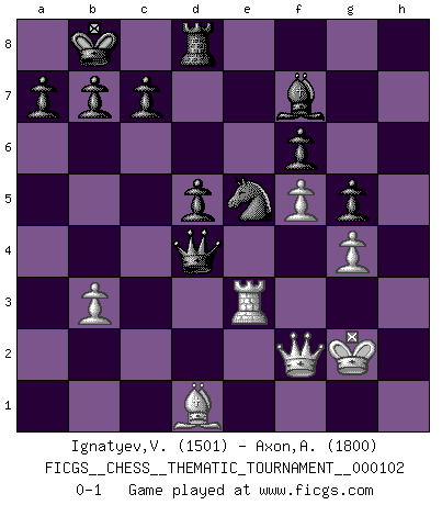 Last move : 0-1 2010 March 12 1:35:32 [Event "FICGS__CHESS__THEMATIC_TOURNAMENT__000102"] [Site "FICGS"] [Date "2010.01.07"] [Round "1"] [White "Ignatyev,Vladimir"] [Black "Axon,Alexander"] [Result "0-1"] [WhiteElo "1501"] [BlackElo "1800"] 1.e4 Nf6 2.e5 Nd5 3.Bc4 Nb6 4.Bb3 g6 5.d4 Bg7 6.f4 d5 7.c3 Nc6 8.Qf3 Bf5 9.Nd2 Qd7 10.h3 O-O-O 11.g4 Be6 12.Bc2 f5 13.exf6 exf6 14.f5 Bf7 15.Qg3 Rhe8+ 16.Kf2 Kb8 17.Ngf3 g5 18.Nb3 Bf8 19.Nc5 Bxc5 20.dxc5 Nc4 21.b3 Qe7 22.Re1 Qxc5+ 23.Kf1 Ne3+ 24.Bxe3 Rxe3 25.Rxe3 Qxe3 26.Qf2 Qxc3 27.Re1 h5 28.Re3 Qa1+ 29.Kg2 Qxa2 30.Bd1 Qa5 31.Rd3 hxg4 32.hxg4 Qb4 33.Nd4 Ne5 34.Re3 Qxd4 0-1 Alekhine's defense Queenside Castling by player Black (move 10) Player Black won this chess game. Follow this game move after move (download)I play correspondence chess because it is both art and science while chess is art only. (A player at FICGS) Die jungen Leute sollen verstehen, dass sie noch etwas von mir lernen können und müssen. (Viktor Kortschnoi) En manos de Fischer's, una diminuta ventaja teórica es tan buena como tener una Reina de ventaja. (Isaac Kashdan) Il vaut toujours mieux jouer un plan faux de façon logique que de n'avoir pas de plan du tout. (Victor Kortchnoï) The absolute truth is the thing that makes people laugh. (Carl Reiner)