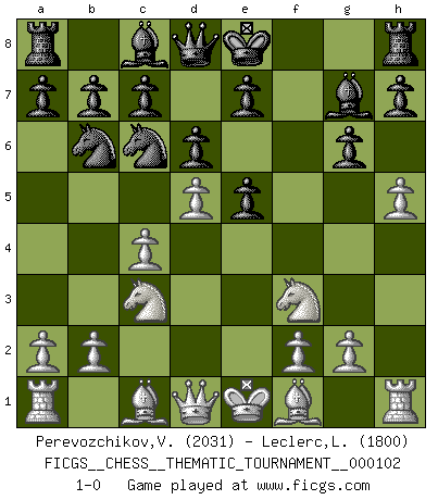 Last move : 1-0 2010 March 8 21:39:28 [Event "FICGS__CHESS__THEMATIC_TOURNAMENT__000102"] [Site "FICGS"] [Date "2010.01.07"] [Round "1"] [White "Perevozchikov,Vjacheslav"] [Black "Leclerc,Luc-Olivier"] [Result "1-0"] [WhiteElo "2031"] [BlackElo "1800"] 1.e4 Nf6 2.e5 Nd5 3.d4 d6 4.Nf3 Nc6 5.c4 Nb6 6.e6 fxe6 7.Nc3 g6 8.h4 Bg7 9.h5 e5 10.d5 1-0 This chess game has been lost on time (started : 2010.01.07 14:14:36) Alekhine's defense : Modern variation Player White won this chess game. Follow this game move after move (download)Nonsense was the last thing Fischer was interested in, as far as Chess was concerned. (Elie Agur) Wie bekannt hörte Morphy 1859 auf, Schach zu spielen. Seine Enttäuschung galt nicht so sehr dem Schach, wie den Schachspielern. (Robert James Fischer) Bobby solo arroja las piezas y solas caen en las casillas correctas. (Miguel Najdorf ) Vouloir jouer aux échecs contre soi-même est aussi paradoxal que vouloir marcher sur son ombre. (Stefan Zweig) The only difference between a tax man and a taxidermist is that the taxidermist leaves the skin. (Mark Twain)