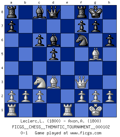 Last move : 0-1 2010 April 23 9:26:29 [Event "FICGS__CHESS__THEMATIC_TOURNAMENT__000102"] [Site "FICGS"] [Date "2010.01.07"] [Round "1"] [White "Leclerc,Luc-Olivier"] [Black "Axon,Alexander"] [Result "0-1"] [WhiteElo "1800"] [BlackElo "1800"] 1.e4 Nf6 2.Nc3 e5 3.Nf3 Nc6 4.d4 exd4 5.Nxd4 Bb4 6.Nxc6 bxc6 7.Bd3 d5 8.exd5 cxd5 9.O-O O-O 10.Bg5 c6 11.Qf3 Bd6 12.Rfe1 h6 0-1 This chess game has been lost on time (started : 2010.01.07 14:14:36) Alekhine's defense Kingside Castling by player White (move 9) Kingside Castling by player Black (move 9) Player Black won this chess game. Follow this game move after move (download)When your house is on fire, you can't be bothered with the neighbors. Or, as we say in Chess, if your King is under attack you don't worry about losing a Pawn on the Queen's side. (Gary Kasparov) Kritik überlasse ich den Spießern. Ich zeige nichts, wofür ich mich schämen muss. (Alexandra Kosteniuk) El Peón aislado arroja penumbra sobre todo el tablero. (Aaron Nimzovich) À la honte des hommes, on sait que les lois du jeu sont les seules qui soient partout justes, claires, inviolables et exécutées. Pourquoi l'Indien qui a donné les règles du jeu d'échecs est-il obéi de bon gré dans toute la terre, et que les décrétales des papes, par exemple, sont aujourd'hui un objet d'horreur et de mépris ? C'est que l'inventeur des échecs combina tout avec justesse pour la satisfaction des joueurs, et que les papes, dans leurs décrétales, n'eurent en vue que leur seul avantage. L'Indien voulut exercer également l'esprit des hommes et leur donner du plaisir; les papes ont voulu abrutir l'esprit des hommes. Voltaire (Dictionnaire philosophique / Garnier 1967) Drag your thoughts away from your troubles... by the ears, by the heels, or any other way you can manage it. (Mark Twain)