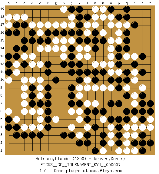 Last move : 1-0 2006 November 30 0:51:25 [Event "FICGS__GO__TOURNAMENT_KYU__000007"] [Site "FICGS"] [Date "2006.10.14"] [Round "1"] [Black "Brisson,Claude"] [White "Groves,Don"] [Result "1-0"] [Rating 1 "1300"] 1.q16 c16 2.c3 q3 3.q5 r5 4.r6 r4 5.q6 e17 6.p3 q2 7.p2 q4 8.p4 c10 9.s3 o17 10.q14 l17 11.f4 q17 12.r17 p16 13.q18 p17 14.q15 c6 15.d7 c7 16.d8 c8 17.k10 d4 18.d3 c4 19.f6 e4 20.e3 o14 21.q10 l14 22.g10 e10 23.e15 f14 24.d16 d17 25.c15 e16 26.d15 e12 27.c17 c18 28.b17 b18 29.b16 c13 30.b14 a17 31.b13 b12 32.c12 d12 33.c14 d13 34.f15 g15 35.f16 f17 36.g16 g17 37.h16 h15 38.j3 h17 39.j16 j15 40.k16 j17 41.k17 l16 42.k18 j18 43.r2 e6 44.f8 e8 45.e7 e9 46.o10 p11 47.q11 q13 48.p13 o12 49.p12 o11 50.p10 o13 51.p14 p15 52.b4 b5 53.b3 d6 54.n11 m9 55.l11 l10 56.m10 l9 57.k11 k9 58.j9 n9 59.j8 k8 60.k7 l7 61.l6 m7 62.m6 o9 63.o7 o6 64.p7 p5 65.n6 n5 66.m4 o4 67.n3 p6 68.o5 m12 69.m11 n12 70.k15 k14 71.l15 m15 72.p18 o18 73.l18 m18 74.j14 g14 75.m16 m17 76.m14 l13 77.n15 n16 78.m15 o15 79.j13 j12 80.k12 k13 81.h12 h13 82.j11 h14 83.j12 e14 84.a12 b11 85.a16 a18 86.d9 c9 87.n19 n18 88.o19 m19 89.q19 r8 90.q8 q9 91.p9 s6 92.s7 s4 93.t6 s2 94.t2 r1 95.s1 q1 96.f9 r3 97.s2 t4 98.f12 d10 99.f7 e5 100.j19 h19 101.k19 g5 102.f5 k5 103.a11 a10 104.a13 p19 105.o19 o2 106.n2 l4 107.l3 k3 108.k2 j4 109.h3 j6 110.l5 o3 111.a5 a6 112.a4 t5 113.t7 k6 114.j7 p1 115.p5 m2 116.f11 m3 117.l2 r7 118.s5 n1 119.m1 s6 120.s8 s9 121.s5 n19 122.s6 r10 123.s11 r11 124.r12 r13 125.s13 1-0 Here are the names of the openings (joseki) played in the four corners : Corner q4 : q3 q5 Komoku (Somok, Xiao~mu`) 3-4 Point. The komoku (3-4) point is the traditional corner enclosure move.. Ikken Takagakari (Hankan Nop'dakeolch'im, Yi Gaogua`jiao~, 1-Space High Approach). The 5-4 approach move has become more popular in modern times, as modern Go emphasizes speed and influence. Corner q16 : q16 o17 Hoshi (Hwajeom, Seongjeom, Xingwei`) 4-4 Point. The star or hoshi (4-4) point, emphasizing influence at the potential expense of territory. Ikken Kakari (Hankan Keolch'im, Yi Gua`jiao~, 1-Space Low Approach). White 2 is the standard approach move to the 4-4. Player Black won this Go (weiqi, baduk) game. Follow this game move after move (download)A knight's move near the edge of the board cannot be cut. (Bill Taylor) The ultimate in disposing one's troops is to be without ascertainable shape. Then the most penetrating spies cannot pry in nor can the wise lay plans against you. (Sun Tzu)