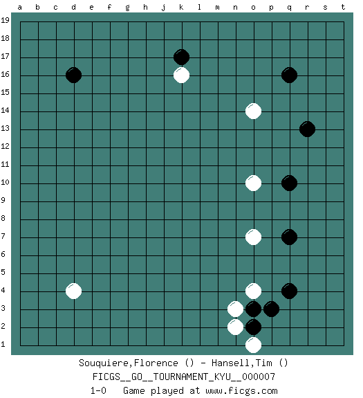 Last move : 1-0 2006 December 17 6:44:6 [Event "FICGS__GO__TOURNAMENT_KYU__000007 "] [Site "FICGS"] [Date "2006.10.14"] [Round "1"] [Black "Souquiere,Florence "] [White "Hansell,Tim "] [Result "1-0"] 1.q16 d4 2.d16 o14 3.q4 o4 4.q7 o7 5.k17 k16 6.r13 o10 7.q10 o1 8.o2 n2 9.o3 n3 10.p3 1-0 This go game has been lost on time (started : 2006.10.14 13:41:33) Here are the names of the openings (joseki) played in the four corners : Corner q16 : q16 o14Hoshi (Hwajeom, Seongjeom, Xingwei`) 4-4 Point. The star or hoshi (4-4) point, emphasizing influence at the potential expense of territory. Corner q4 : q4 o4Hoshi (Hwajeom, Seongjeom, Xingwei`) 4-4 Point. The star or hoshi (4-4) point, emphasizing influence at the potential expense of territory.Ikken Takagakari (Hankan Nop'dakeolch'im, Yi Gaojia, 1-Space High Approach). Black typically responds at 6-4 or 3-10. Black 4-10 is played when Black finds play on the right side advantageous. Black 4-8 or 3-8 may be played when Black has support at top. Player Black won this Go (weiqi, baduk) game.Follow this game move after move (download ) Pon-nuki is worth thirty points. (Anonymous) Mac users swear by their computers. PC users swear at their computers. (Author unknown)