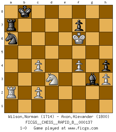 Last move : 1-0 2010 May 21 8:27:9 [Event "FICGS__CHESS__RAPID_B__000137"] [Site "FICGS"] [Date "2010.01.08"] [Round "1"] [White "Wilson,Norman"] [Black "Axon,Alexander"] [Result "1-0"] [WhiteElo "1714"] [BlackElo "1800"] 1.e4 c5 2.Nf3 d6 3.d4 cxd4 4.Nxd4 Nf6 5.Nc3 Nc6 6.Be2 g6 7.Be3 Bg7 8.O-O O-O 9.Re1 Bd7 10.Nb3 Rc8 11.f3 Ne5 12.Bxa7 Rxc3 13.bxc3 b6 14.Qd4 Nc6 15.Qxb6 Qa8 16.a4 Qxa7 17.Qxa7 Nxa7 18.Ba6 Ne8 19.Nd4 Nc7 20.Bd3 Ne6 21.Ne2 Ra8 22.a5 Nb5 23.Bxb5 Bxb5 24.Ra3 Ba6 25.Kf2 Kf8 26.Rb1 Ke8 27.g3 Kd7 28.Rb6 Kc7 29.Rb1 g5 30.Ke3 h5 31.Nc1 Nc5 32.Nd3 e6 33.h3 h4 34.gxh4 gxh4 35.Nb4 Bc4 36.Kf2 Nd7 37.a6 Ra7 38.Rg1 Be5 39.Ke3 Bg3 40.f4 Nf6 41.Rga1 d5 42.exd5 Nxd5+ 43.Kd4 Nb6 44.Nd3 Bd5 45.Ra5 Nd7 46.Rxd5 exd5 47.Kxd5 Nb8 48.Ke5 Nxa6 49.c4 Kb6 50.Rb1+ Kc7 51.Ra1 Kb7 52.Kf6 Kb8 53.Ra2 1-0 This chess game has been lost on time (started : 2010.01.08 12:20:56) Sicilian Kingside Castling by player White (move 8) Kingside Castling by player Black (move 8) Player White won this chess game. Follow this game move after move (download)Bobby Fischer's current state of mind is indeed a tragedy. One of the world's greatest Chess players - the pride and sorrow of American Chess. (Frank Brady) Oft bringt ein stiller Zug das Erdbeben. (Richard Reti) El Ajedrez por encima de todo... ¡es una pelea!. (Emanuel Lasker) Il a essayé de se convaincre qu'il pourrait empêcher toutes les erreurs et ne jamais perdre. L'horreur ! Gary Kasparov au sujet de Robert Fischer. Warrior pose battles inner weakness and wins focus. You see that there is no war within you. You're on your own side, and you are your own strength. (Terri Guillemets)