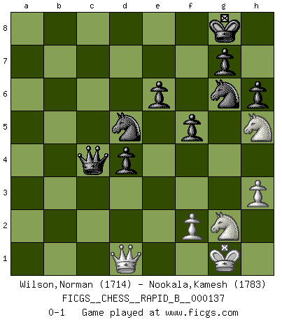 Last move : 0-1 2010 March 5 10:53:49 [Event "FICGS__CHESS__RAPID_B__000137"] [Site "FICGS"] [Date "2010.01.08"] [Round "1"] [White "Wilson,Norman"] [Black "Nookala,Kamesh"] [Result "0-1"] [WhiteElo "1714"] [BlackElo "1783"] 1.e4 c5 2.Nf3 d6 3.Bb5+ Bd7 4.Bxd7+ Qxd7 5.O-O Nc6 6.c3 Nf6 7.Re1 e6 8.d3 Be7 9.Nbd2 O-O 10.Nf1 h6 11.h3 d5 12.e5 Nh7 13.Ng3 Rfb8 14.Nh5 Nf8 15.Bf4 Ng6 16.Qd2 Qd8 17.Red1 d4 18.c4 b5 19.cxb5 Rxb5 20.b3 a5 21.Qc2 a4 22.bxa4 Rba5 23.Rdb1 Rxa4 24.a3 Rxa3 25.Rxa3 Rxa3 26.Rb3 Nb4 27.Qb1 Qa8 28.Rxa3 Qxa3 29.Ne1 Bg5 30.g3 Bxf4 31.gxf4 Qc3 32.Qd1 Nd5 33.Ng2 c4 34.dxc4 Qxc4 35.f5 exf5 36.e6 fxe6 0-1 Sicilian : Canal-Sokolsky attack, 3...Bd7 Kingside Castling by player White (move 5) Kingside Castling by player Black (move 9) Player Black won this chess game. Follow this game move after move (download)You must take your opponent into a deep dark forest where 2+2=5, and the path leading out is only wide enough for one. (Mikhail Tal) Schach ist das schnellste Spiel der Welt, weil man in jeder Sekunde Tausende von Gedanken ordnen muß. (Albert Einstein) Un jugador que trata de regresar una movida en el Ajedrez es un futuro carterista. (Richard Fenton) La vie et les Echecs sont tous les deux une lutte constante. (Lasker) Art is the only way to run away without leaving home. (Twyla Tharp)