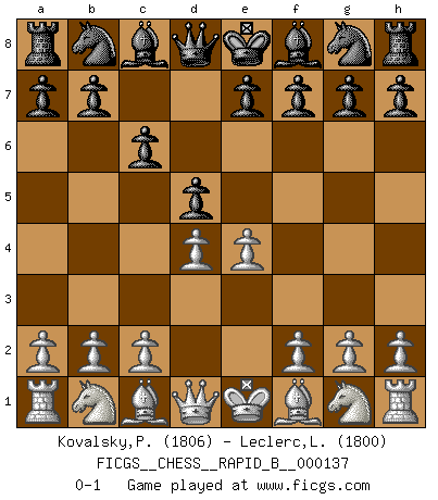 Last move : 0-1 2010 March 3 9:34:55 [Event "FICGS__CHESS__RAPID_B__000137"] [Site "FICGS"] [Date "2010.01.08"] [Round "1"] [White "Kovalsky,Petr"] [Black "Leclerc,Luc-Olivier"] [Result "0-1"] [WhiteElo "1806"] [BlackElo "1800"] 1.e4 c6 2.d4 d5 0-1 This chess game has been lost on time (started : 2010.01.08 12:20:56) Caro-Kann defense Player Black won this chess game. Follow this game move after move (download)Via the squares on the chessboard, the Indians explain the movement of time and the age, the higher influences which control the world and the ties which link Chess with the human soul. (Al-Masudi) Schach ist die gewalttätigste aller Sportarten. (Garry Kasparov) Me siento como si fuera una pieza en una partida de Ajedrez, cuando mi oponente me indica: esa pieza no puede ser movida. (Soren Kierkegaard) Donnez-moi un Cavalier en 6e et je gagnerais toutes mes parties. (Steinitz) Always be a first-rate version of yourself, instead of a second-rate version of somebody else. (Judy Garland)
