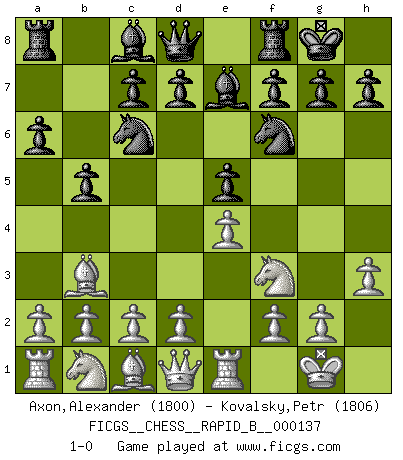 Last move : 1-0 2010 March 7 21:40:26 [Event "FICGS__CHESS__RAPID_B__000137"] [Site "FICGS"] [Date "2010.01.08"] [Round "1"] [White "Axon,Alexander"] [Black "Kovalsky,Petr"] [Result "1-0"] [WhiteElo "1800"] [BlackElo "1806"] 1.e4 e5 2.Nf3 Nc6 3.Bb5 a6 4.Ba4 Be7 5.O-O Nf6 6.Re1 b5 7.Bb3 O-O 8.h3 1-0 This chess game has been lost on time (started : 2010.01.08 12:20:56) Ruy Lopez Kingside Castling by player White (move 5) Kingside Castling by player Black (move 7) Player White won this chess game. Follow this game move after move (download)Chess is above all, a fight ! (Emanuel Lasker) Wenn Spassky eine Figur opfert kannst du genauso gut aufgeben. Aber wenn Tal eine Figur opfert, spiel weiter. Er könnte noch eine weitere opfern, und dann ... wer weiß? (Miguel Najdorf) Todavía soy una víctima del Ajedrez. Tiene toda la belleza del arte y mucho mas. No puede ser comercializado. El Ajedrez es mas puro que el arte en su posición social. (Marcel Duchamp) Même un GMI sait rarement calculer sur plus de cinq coups une attaque à sacrifices. (Rudolf Spielmann) Luck has a peculiar habit of favoring those who don't depend on it. (Author unknown)