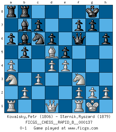 Last move : 0-1 2010 March 9 21:50:19 [Event "FICGS__CHESS__RAPID_B__000137"] [Site "FICGS"] [Date "2010.01.08"] [Round "1"] [White "Kovalsky,Petr"] [Black "Sternik,Ryszard"] [Result "0-1"] [WhiteElo "1806"] [BlackElo "1879"] 1.e4 e5 2.Nf3 Nc6 3.Bb5 a6 4.Ba4 Nf6 5.O-O Bc5 6.c3 b5 7.Bb3 d6 8.d4 Bb6 9.a4 Bb7 10.Bg5 h6 11.Bxf6 Qxf6 12.Bd5 O-O 13.Na3 Rfb8 0-1 This chess game has been lost on time (started : 2010.01.08 12:20:56) Ruy Lopez : Moeller defense Kingside Castling by player White (move 5) Kingside Castling by player Black (move 12) Player Black won this chess game. Follow this game move after move (download)Pawn endings are to Chess what putting is to golf. (Cecil Purdy) Das Spiel gibt uns die Genugtuung, die das Leben uns versagt. (Emanuel Lasker) Repentinamente, me resultaba obvio en mi analisis que yo había pasado por alto lo que Fischer había visto en el tablero con la mas grande facilidad. (Mikhail Botvinnik) Psychologiquement, tu dois avoir confiance en toi même, mais cette confiance doit être basée sur des faits. (Robert Fischer) Ah, beer! The cause of, and the solution to, all of life's problems. (Homer Simpson)
