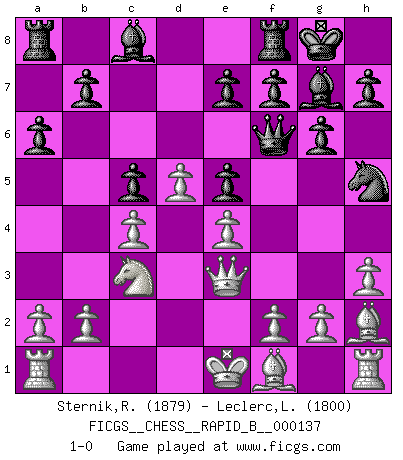 Last move : 1-0 2010 February 16 13:37:43 [Event "FICGS__CHESS__RAPID_B__000137"] [Site "FICGS"] [Date "2010.01.08"] [Round "1"] [White "Sternik,Ryszard"] [Black "Leclerc,Luc-Olivier"] [Result "1-0"] [WhiteElo "1879"] [BlackElo "1800"] 1.Nf3 g6 2.e4 Bg7 3.d4 d6 4.c4 Nf6 5.Nc3 O-O 6.h3 c5 7.d5 Nbd7 8.Bf4 Nh5 9.Bh2 Ne5 10.Nxe5 dxe5 11.Qd2 Qd6 12.Nb5 Qf6 13.Qe3 a6 14.Nc3 1-0 Reti Opening Kingside Castling by player Black (move 5) Player White won this chess game. Follow this game move after move (download)I have never in my life played the French Defence, which is the dullest of all openings. (Wilhelm Steinitz) Gott hat gewollt, dass ich Champion werde. (Surab Azmajparaschvili) Alekhine es un poeta que crea un trabajo de arte de algo que raramente inspiraría a otra persona a mandar una tarjeta postal. (Max Euwe) Nous sommes les pions de la mystérieuse partie d'Echecs jouée par Dieu. Il nous déplace, nous arrête, nous pousse encore, puis nous lance un à un dans la boîte du Néant. Epitaphe sur la tombe de David Janowsky (1868-1927). I know the human being and fish can coexist peacefully. (George W. Bush, Saginaw sept. 29, 2000)