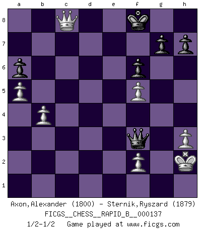 Last move : 1/2-1/2 2010 March 7 17:8:46 [Event "FICGS__CHESS__RAPID_B__000137"] [Site "FICGS"] [Date "2010.01.08"] [Round "1"] [White "Axon,Alexander"] [Black "Sternik,Ryszard"] [Result "1/2-1/2"] [WhiteElo "1800"] [BlackElo "1879"] 1.e4 e5 2.Nf3 Nc6 3.Bb5 a6 4.Ba4 Nf6 5.O-O Bc5 6.c3 b5 7.Bb3 d6 8.a4 Bg4 9.h3 Bh5 10.d3 b4 11.Nbd2 Na5 12.Bc2 O-O 13.d4 bxc3 14.dxc5 cxd2 15.Bxd2 Nb7 16.cxd6 Nxd6 17.Re1 Qe7 18.g4 Bg6 19.Bc3 Nfxe4 20.Bxe5 Rad8 21.Qd5 Rfe8 22.Rac1 c5 23.Rcd1 Nc8 24.Qc6 Ng5 25.Nxg5 Bxc2 26.Rxd8 Qxd8 27.Qxc5 Bb3 28.Nf3 f6 29.Bc3 Rxe1+ 30.Bxe1 Qe8 31.a5 Ne7 32.Nd4 Bf7 33.Bb4 Nd5 34.Nf5 Be6 35.Qd6 Nxb4 36.Qxb4 Bxf5 37.gxf5 Qc6 38.Qb8+ Kf7 39.b4 Ke7 40.Qg3 Kf8 41.Kh2 Kf7 42.Qb3+ Kf8 43.Qe6 Qf3 44.Qc8+ 1/2-1/2 Ruy Lopez : Moeller defense Kingside Castling by player White (move 5) Kingside Castling by player Black (move 12) This chess game ended in a draw. Follow this game move after move (download)Daring ideas are like Chess men moved forward. They may be beaten, but they may start a winning game. (Johann Wolfgang von Goethe) Die Fehler sind da, Sie warten nur darauf gemacht zu werden. (Savielly Grigorievitsch Tartakower) Hay dos clases de hombres: aquellos que se conforman en dejarse llevar por las circunstancias y que juegan barajas y aquellos decididos a controlar las circunstancias y que juegan al Ajedrez. (Mortimer Collins) Soyez une menace à chaque fois que vous vous asseyez pour jouer. (Ken Smith) Life is like a ten-speed bicycle: most of us have gears we never use. (Charles M. Schulz)