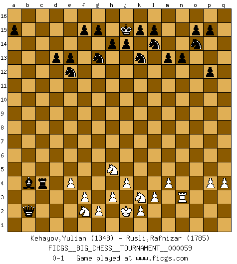 Last move : 0-1 2010 May 27 10:35:1 [Event "FICGS__BIG_CHESS__TOURNAMENT__000059"] [Site "FICGS"] [Date "2010.01.10"] [Round "1"] [White "Kehayov,Yulian"] [Black "Rusli,Rafnizar"] [Result "0-1"] [WhiteElo "1348"] [BlackElo "1785"] 1.j2-k4 h15-g13 2.h1-o7 m15-m13 3.o7-c7 j15-k13 4.c7-c15 h16-o10 5.c15-f12 o10-o2 6.p1-o3 o2-c13 7.d2-d3 e15-e13 8.f12-f6 d15-d13 9.e2-e4 p16-o14 10.n2-n4 k16-l14 11.o1-k5 n15-n13 12.b1-c3 b16-a14 13.m2-m4 o16-g9 14.l1-o4 c13-e11 15.c1-k8 g16-f14 16.f1-e2 e11-j11 17.e2-j6 g9-e7 18.f6-j9 j11-f11 19.f2-f3 f11-n4 20.q1-n1 n4-p6 21.p2-p3 c16-p4 22.n1-n3 p6-q5 23.k5-l6 e7-f8 24.g1-j2 f16-b12 25.l6-k7 b12-c13 26.l2-l3 q15-q13 27.q2-q4 l16-p12 28.k7-m9 q5-q11 29.m9-p12 q13-p12 30.m1-n1 f14-e12 31.o3-n5 p4-h11 32.h2-g4 c13-g9 33.n5-l6 h11-m7 34.k1-m2 m7-l6 35.a2-a3 l6-o9 36.n1-n2 o9-p10 37.n2-n1 q11-k11 38.m2-k3 g9-h10 39.j9-j8 q16-q8 40.k4-l6 p10-l6 41.j8-l6 h10-k8 42.o4-k8 q8-k8 43.j2-k4 k8-k6 44.l6-j4 a16-c16 45.d3-d4 c16-c6 46.j6-a14 b15-a14 47.j4-a12 e16-b16 48.a12-a14 b16-b2 49.c3-d5 c6-c2 50.d5-e3 c2-c15 51.a1-b1 k6-b6 52.j1-j2 k11-j11 53.b1-b2 b6-b2 54.k4-h5 f8-a3 55.j3-j4 j16-j15 56.a14-a13 m16-c16 57.a13-j5 j11-b4 58.p3-p4 b4-d4 59.n1-f1 a3-c5 60.e1-d1 d4-c3 61.j5-e1 c3-a3 62.d1-d2 c5-b4 63.e3-c4 c15-c4 64.e1-e2 b2-d2 65.e2-c4 c16-c4 66.f1-f2 d2-f2 67.g4-f2 a3-b2 0-1 Follow this game move after move (download)Those who say they understand Chess, understand nothing. (Robert Hubner) Das ganze Leben mit einer Ehefrau ist wie ein Endspiel mit ungleichfarbigen Läufern. (Viktor Kortschnoi) La belleza de un movimiento no se refleja solo en su apariencia, sino en el pensamiento detrás de él. (Siegbert Tarrasch) Une platitude souvent récitée à propos des Echecs est qu'une des choses les plus difficiles à réaliser est de gagner une position gagnante. Cela ne manque pas de sens mais, pour ma part, j'ai toujours trouvé plus difficile de gagner une position perdante. (Tim Krabbe) Is not life a hundred times too short to bore ourselves ? (Friedrich Nietzsche)