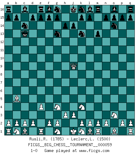 Last move : 1-0 2010 March 18 9:16:50 [Event "FICGS__BIG_CHESS__TOURNAMENT__000059"] [Site "FICGS"] [Date "2010.01.10"] [Round "1"] [White "Rusli,Rafnizar"] [Black "Leclerc,Luc-Olivier"] [Result "1-0"] [WhiteElo "1785"] [BlackElo "1500"] 1.j2-k4 m15-m13 2.h1-o7 h15-g13 3.o7-c7 j15-k13 4.c7-c15 b16-c14 5.c15-j9 h16-o10 6.h2-g4 o10-o2 7.p1-o3 o2-c13 8.e2-e4 p16-o14 9.f1-b5 1-0 This big chess game has been lost on time (started : 2010.01.10 1:24:52) Follow this game move after move (download)Mistrust is the most necessary characteristic of the Chess player. (Siegbert Tarrasch) Irgendwie scheint mir sonntags früh um 9 Uhr der Killerinstinkt verloren gegangen zu sein. (Alexej Shirov) El Ajedrez es en su esencia, un juego. En su forma, un arte. Y en su ejecución, una ciencia. (Baron Tassilo) Tout change constamment, y compris dans le monde des Echecs. (Botvinnik) Perhaps chess is the wrong game for the times (The Chess Master and the Computer, by Garry Kasparov - 2010)